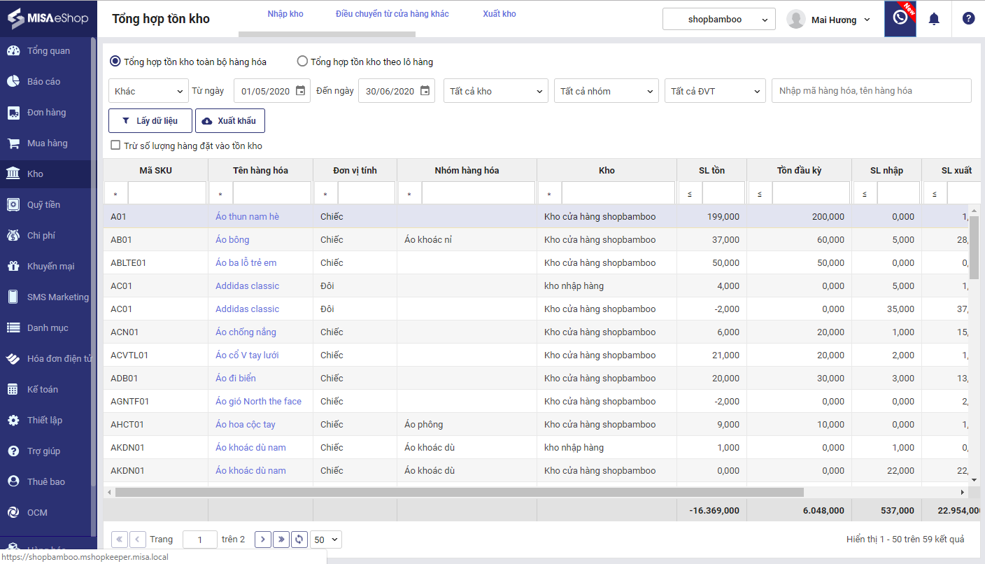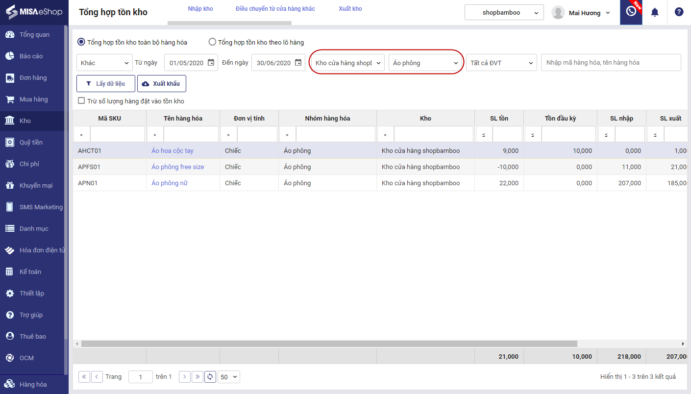 Sau khi khai báo tồn kho ban đầu và lập các phiếu nhập, xuất kho, quản lý cửa hàng có thể theo dõi tình hình nhập, xuất, tồn kho của hàng hóa chi tiết theo từng thời điểm.