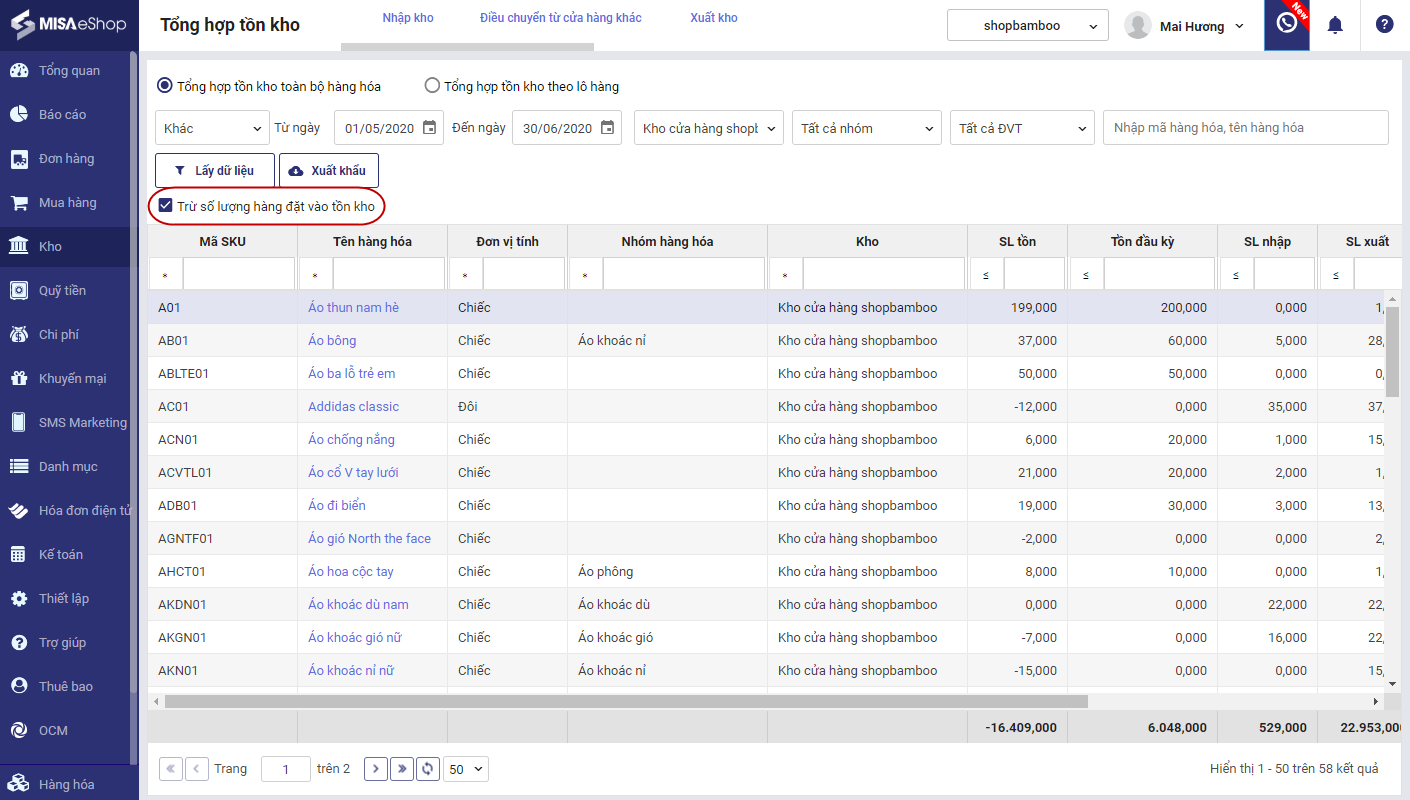 3. Trường hợp khách có đặt trước, tích chọn Trừ số lượng hàng hóa khách đặt vào tồn kho nếu muốn kiểm tra lượng hàng hóa tồn kho đã trừ số lượng khách đặt trước.
