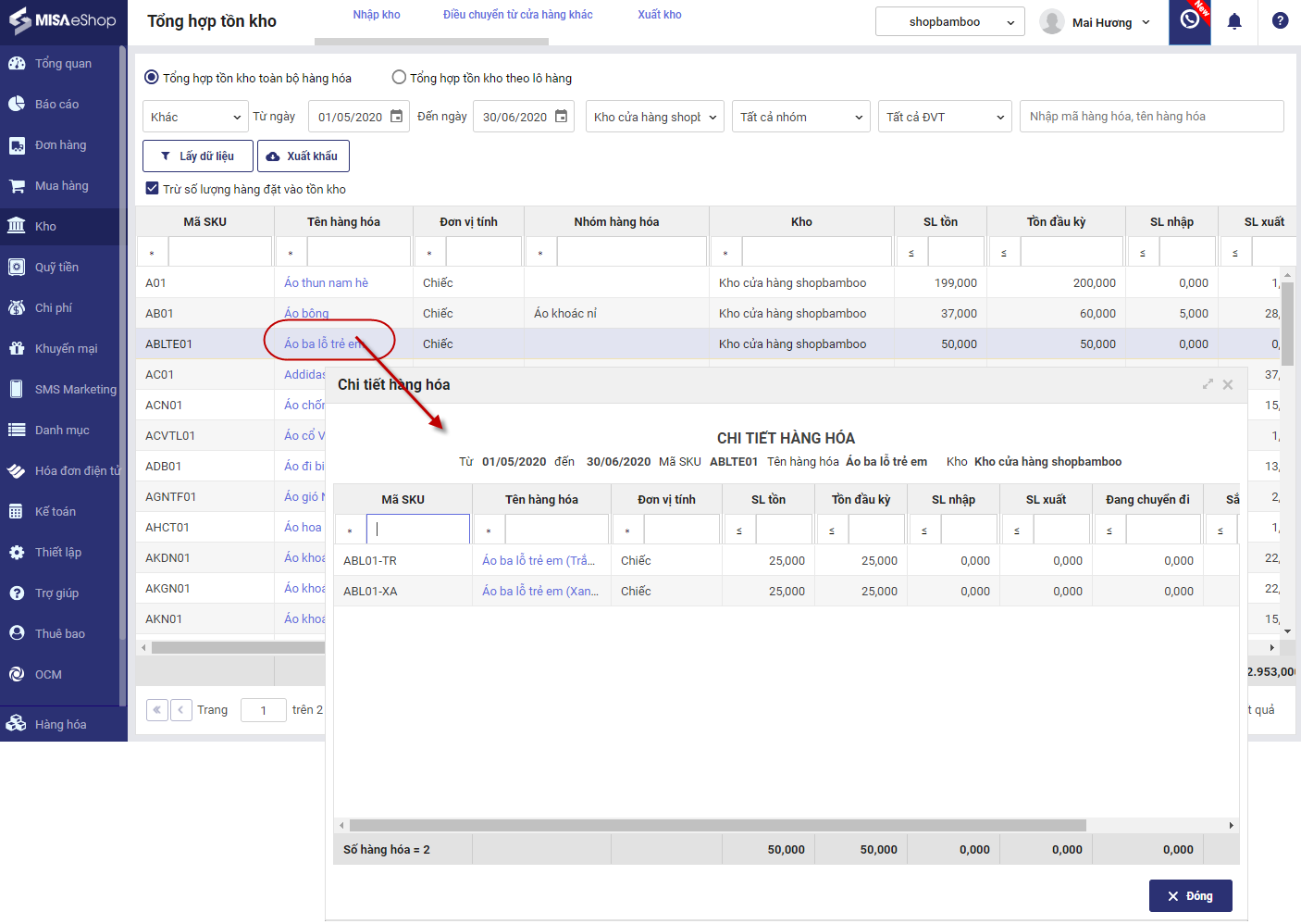 4. Nhấn vào hàng hóa để xem tình hình nhập, xuất, tồn từng mặt hàng chi tiết.