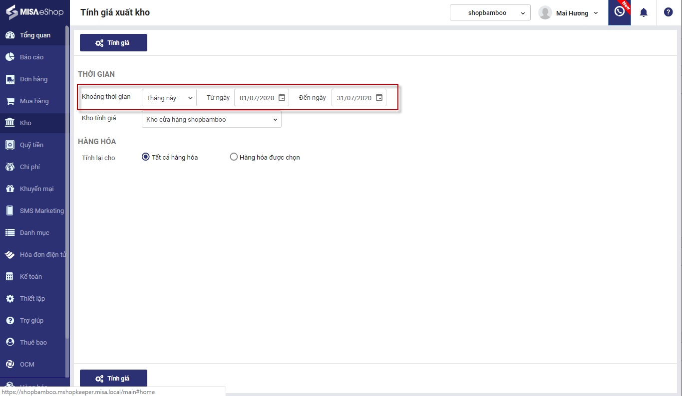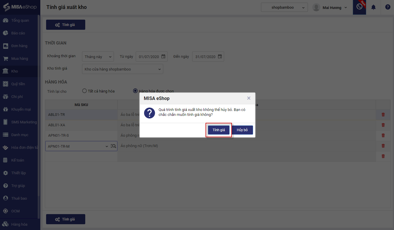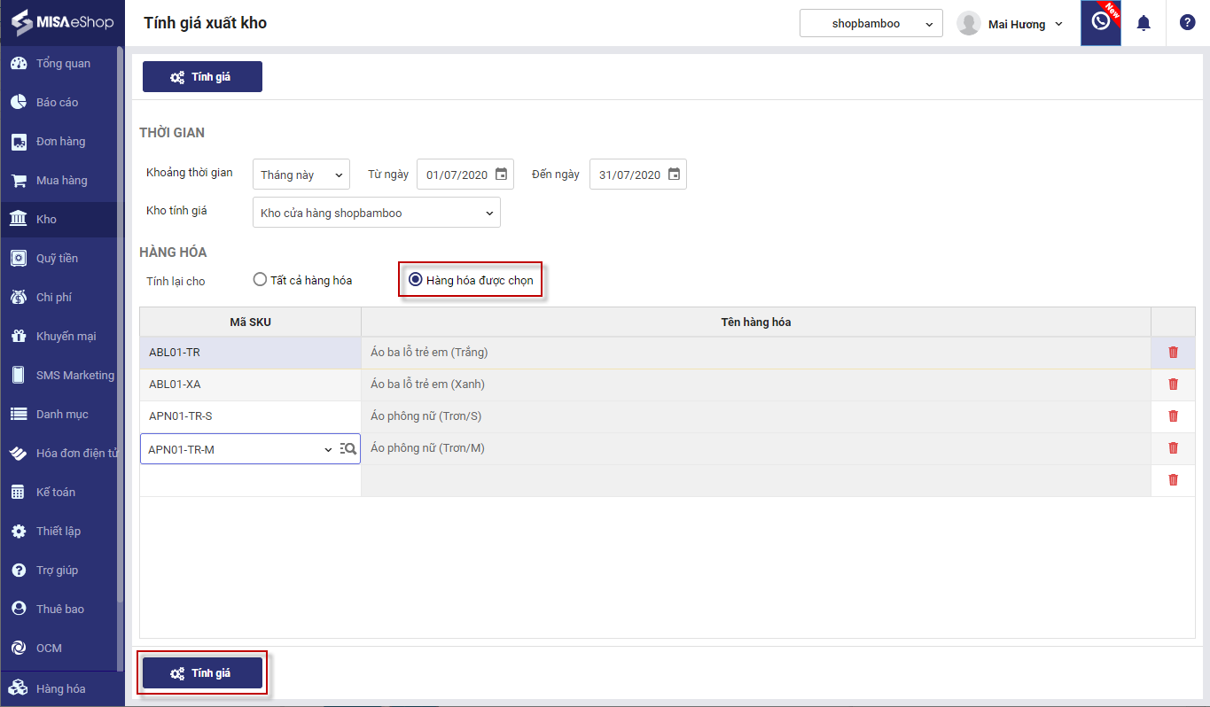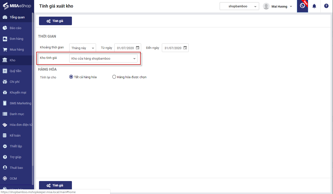 3. Chọn kho muốn tính lại giá xuất kho.