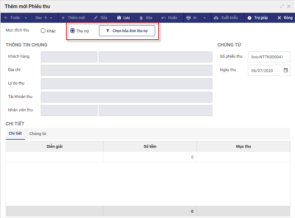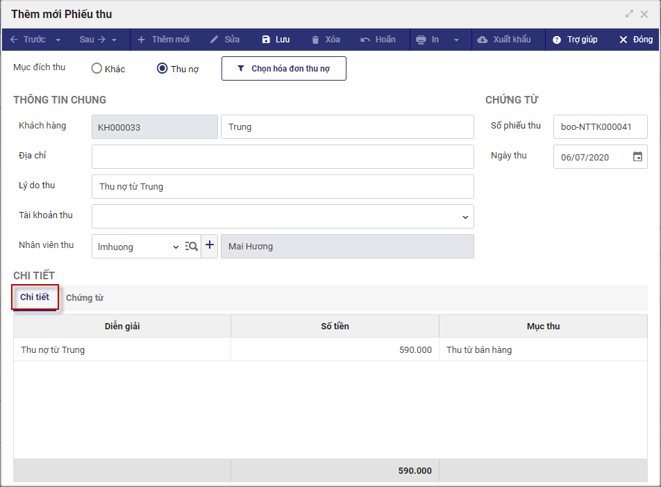 3. Chọn mục đích thu là Thu nợ.
