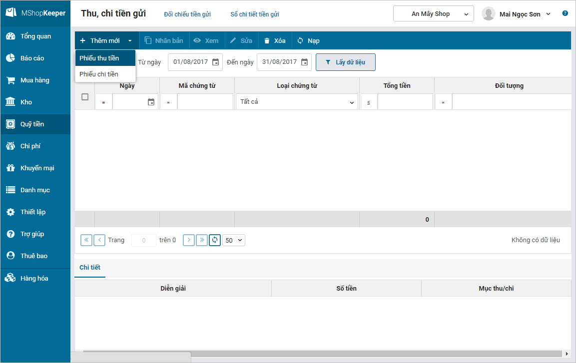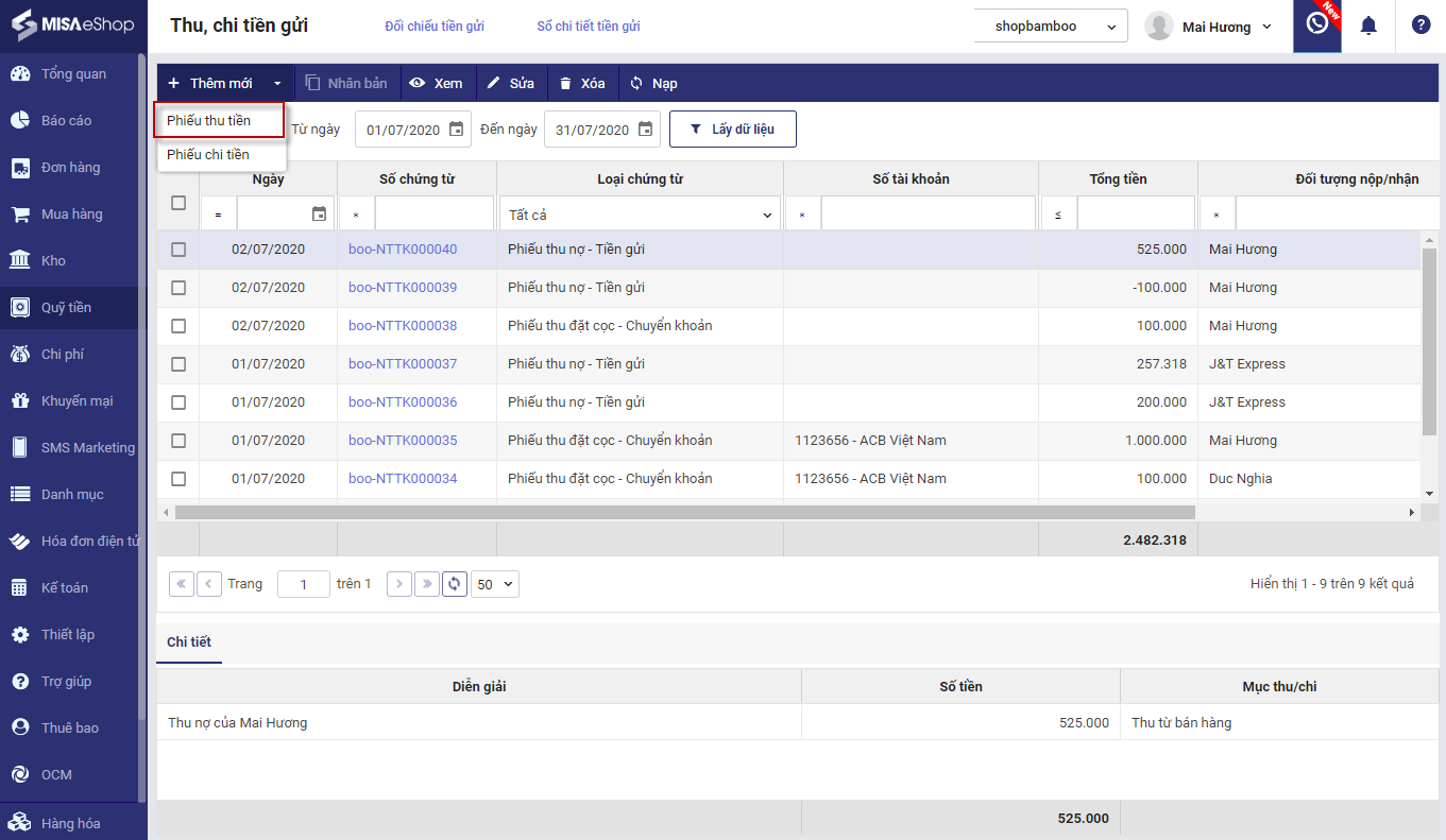 2. Nhấn Thêm mới, chọn Phiếu thu tiền.