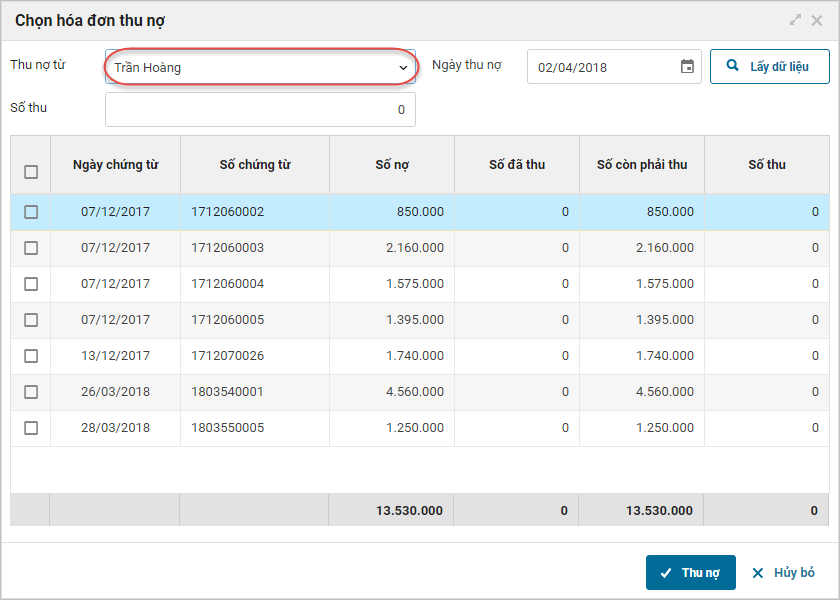 5. Chọn khách hàng trả nợ, sau đó nhấn Lấy dữ liệu. Hệ thống tự động lọc ra các chứng từ còn nợ của khách hàng tính đến ngày thu tiền.