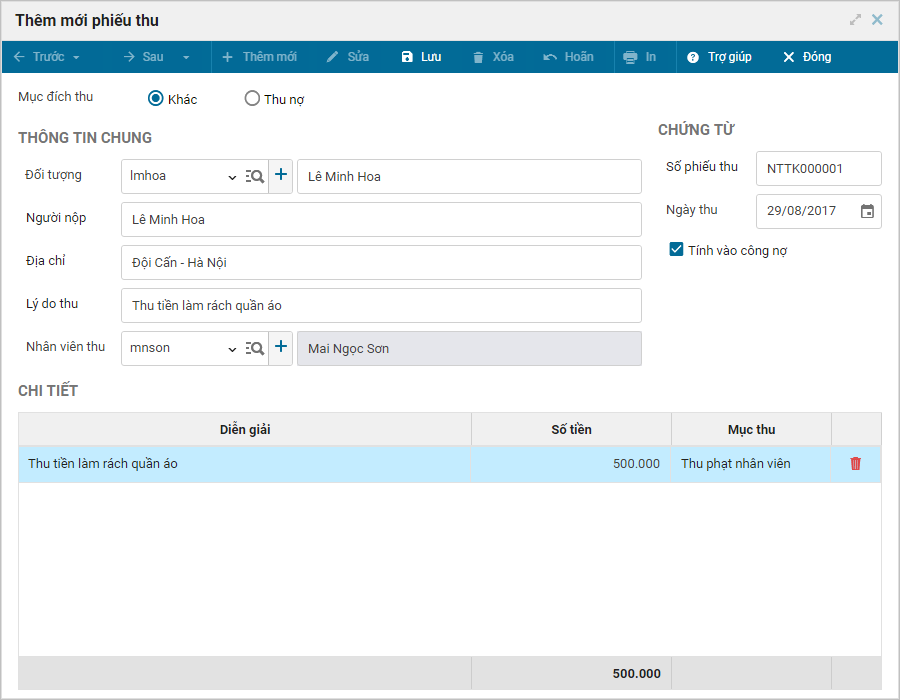 - Thu khác (như tiền phạt/bồi thường của nhân viên, tiền thanh lý tài sản dụng cụ, tiền hoa hồng của nhà cung cấp,…)