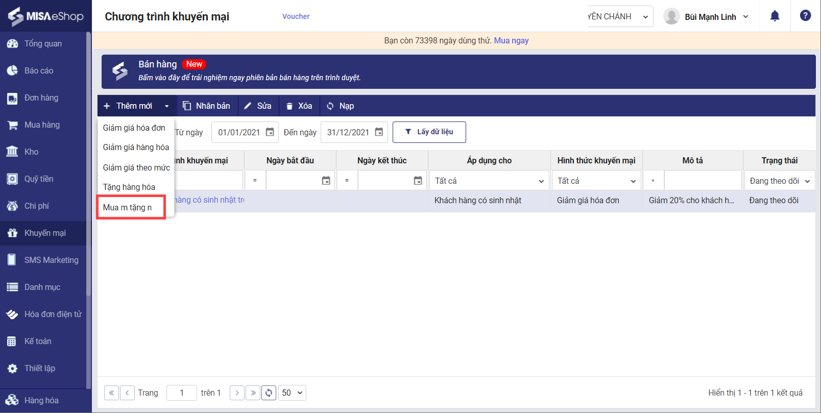 2. Nhấn Thêm mới, Chọn chương trình Mua m tặng n.