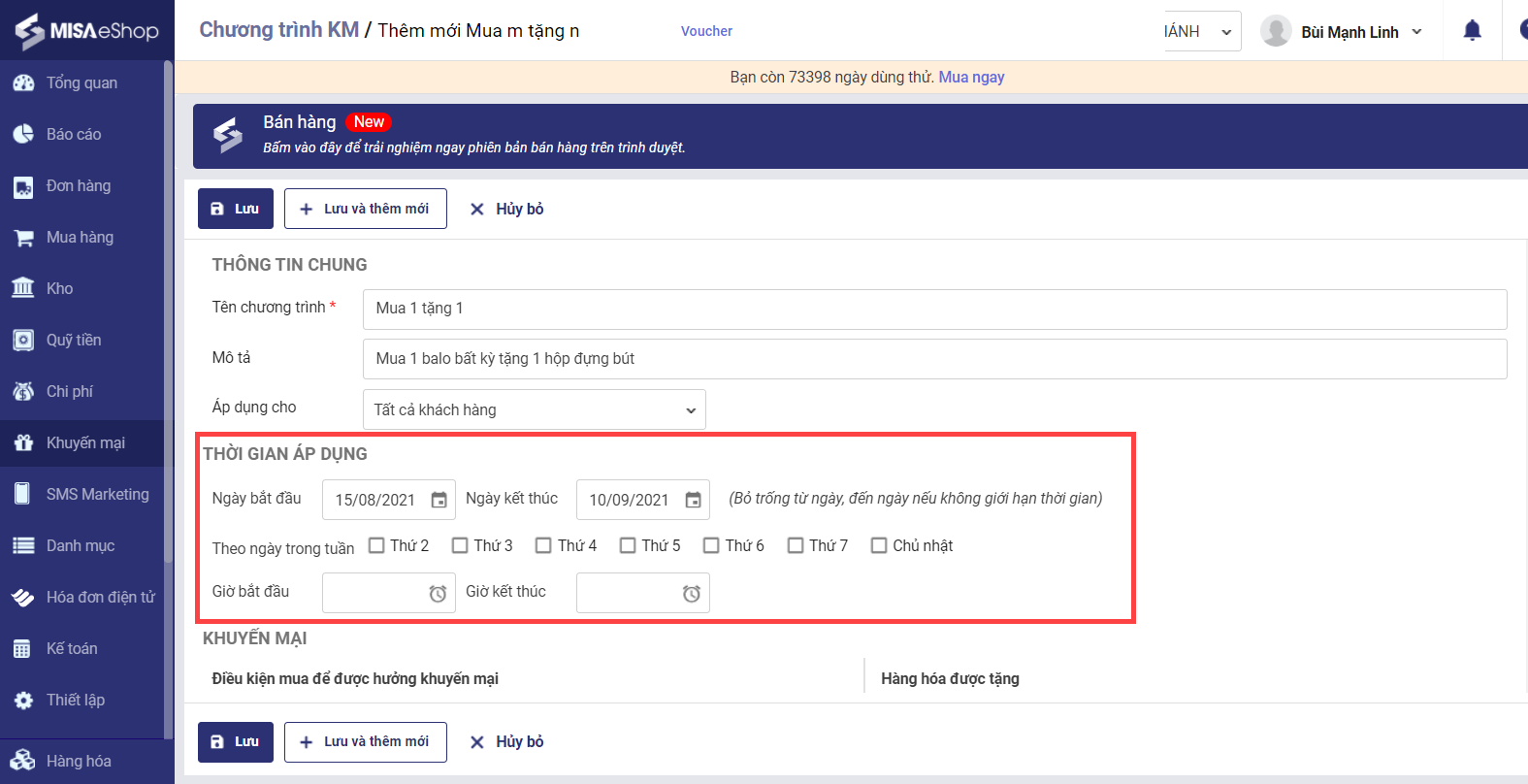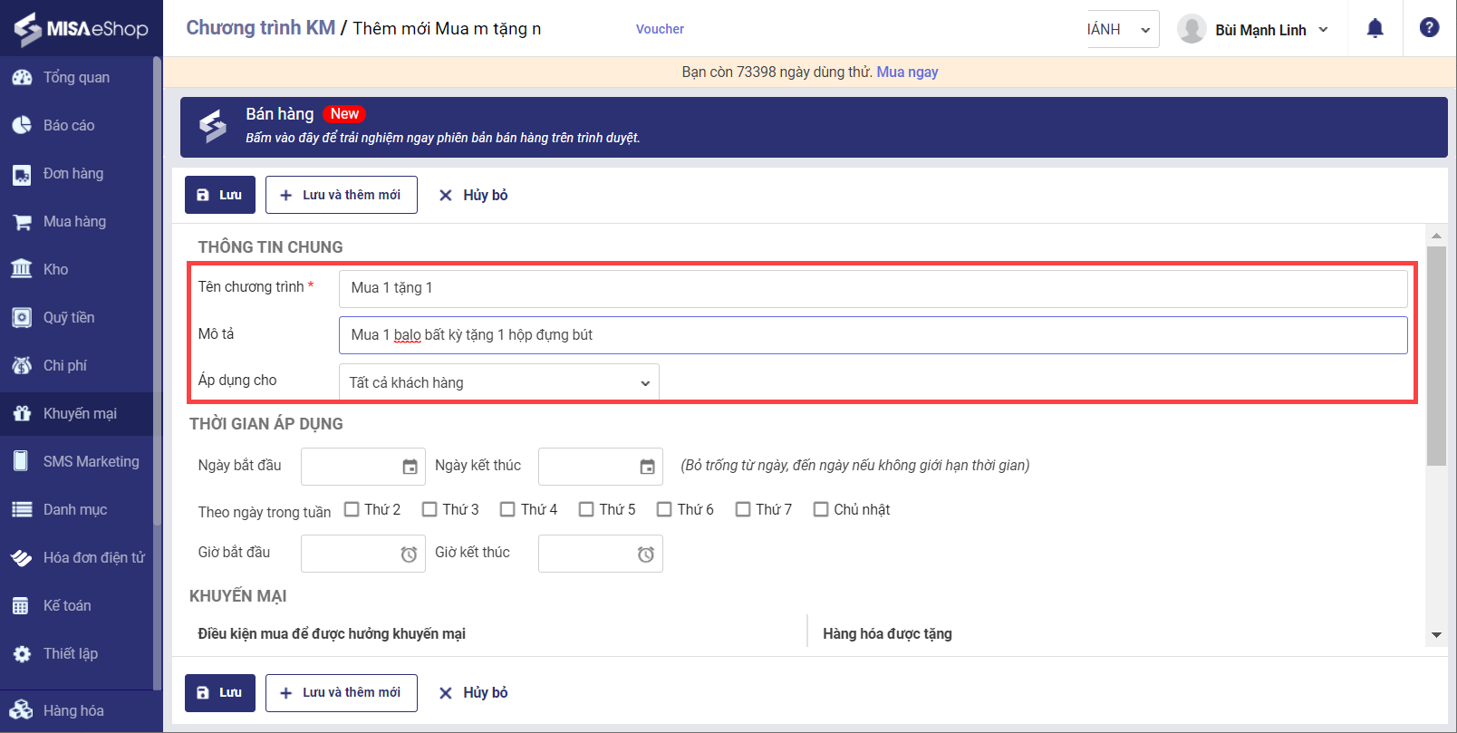 3. Khai báo các thông tin chương trình khuyến mại dựa trên chính sách bán hàng của cửa hàng.