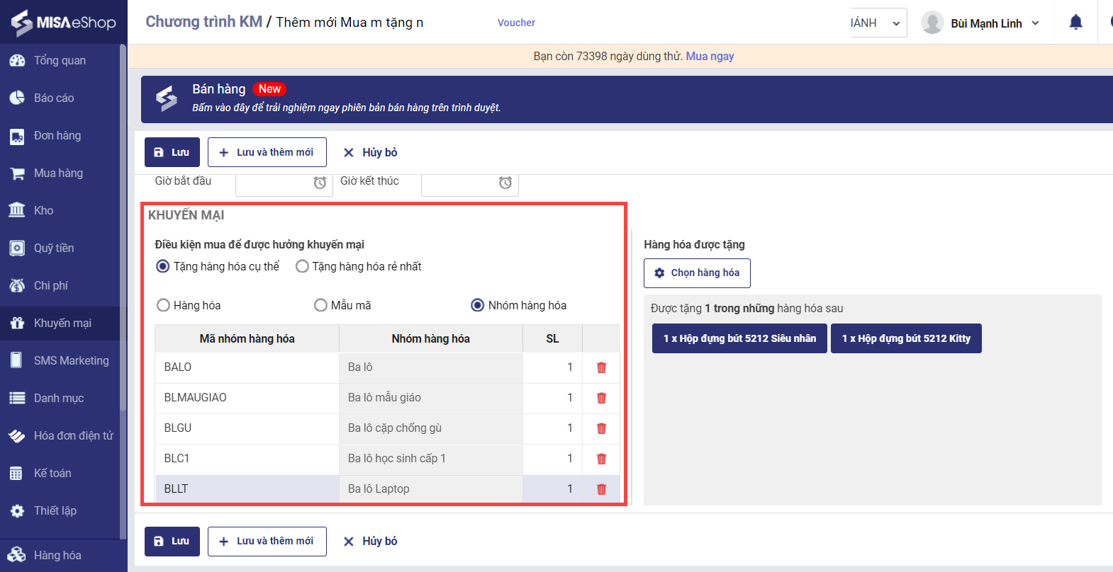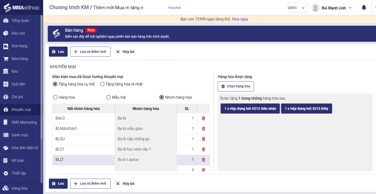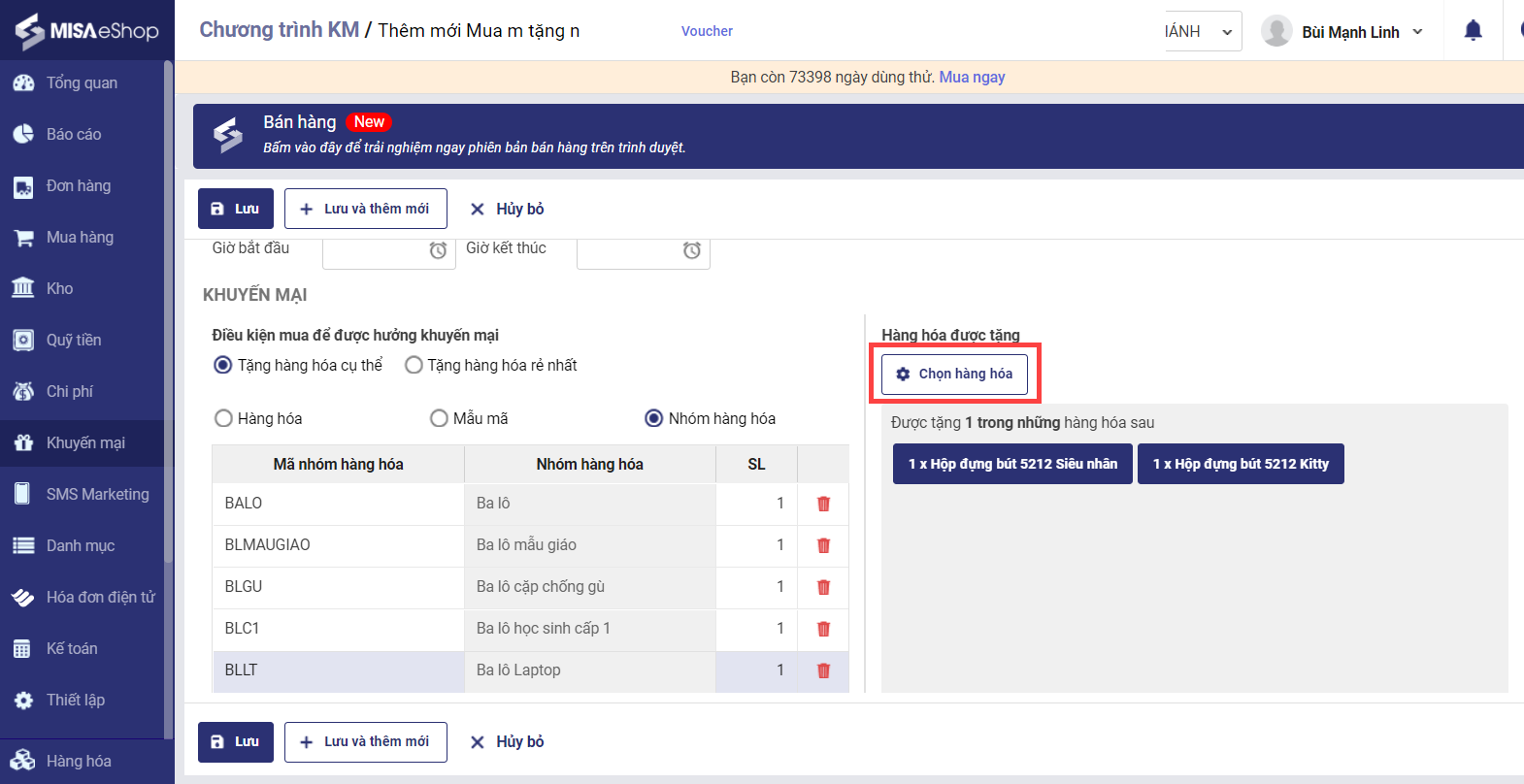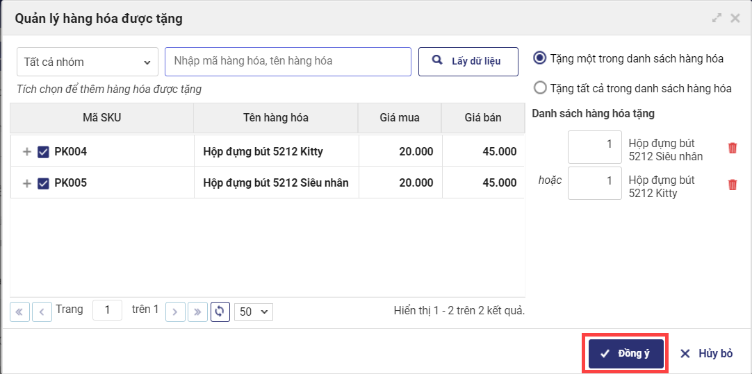 - Tích chọn hàng hóa được tặng, có thể chọn theo hàng hóa hoặc theo mẫu mã.