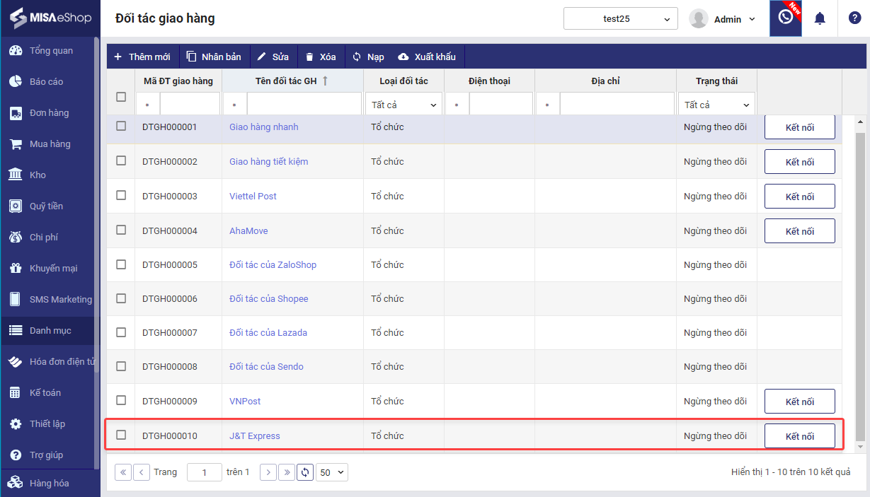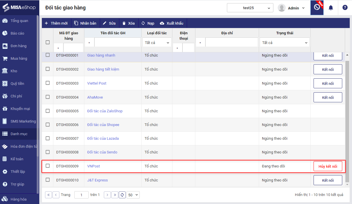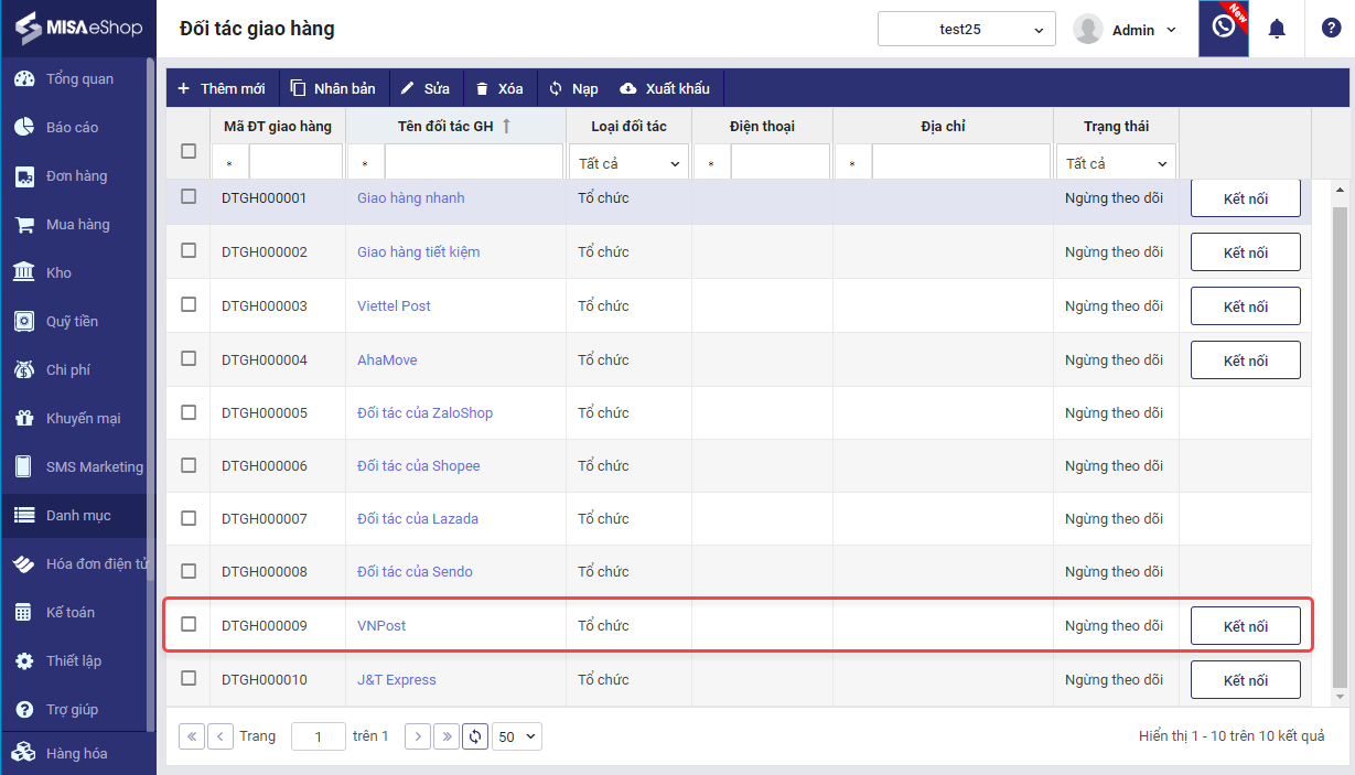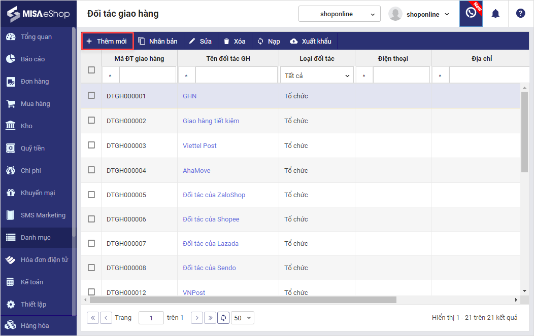 1. Vào Danh mục\Đối tác giao hàng.