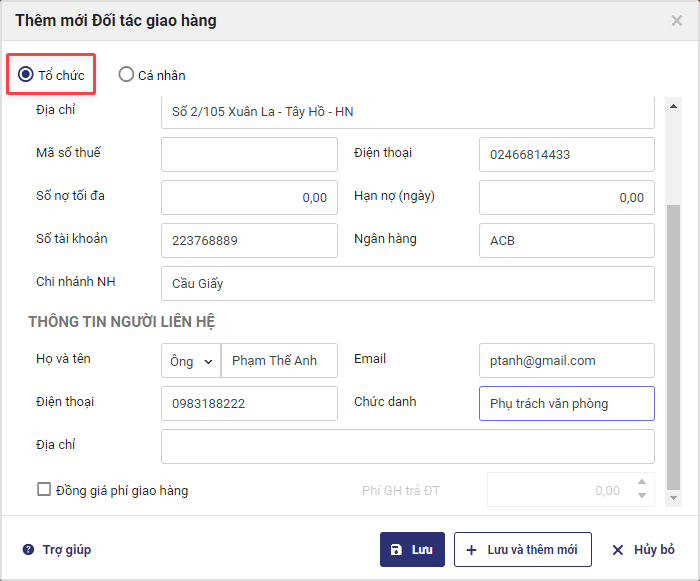 2.1 Khai báo đối tác giao hàng