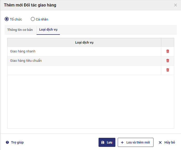 5. Chương trình đã mặc định sẵn 2 loại hình giao hàng: Giao hàng nhanh, Giao hàng tiêu chuẩn. Nếu muốn khai báo thêm loại hình khác, nhấn chọn tab Loại dịch vụ để khai báo.