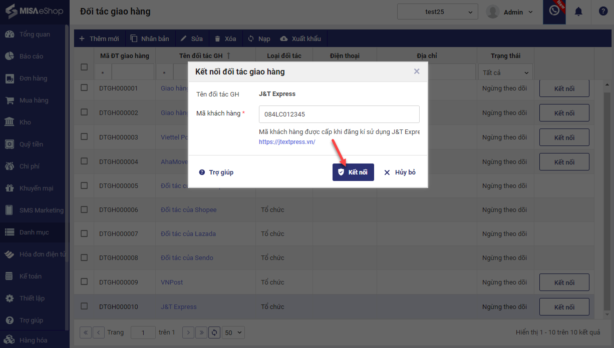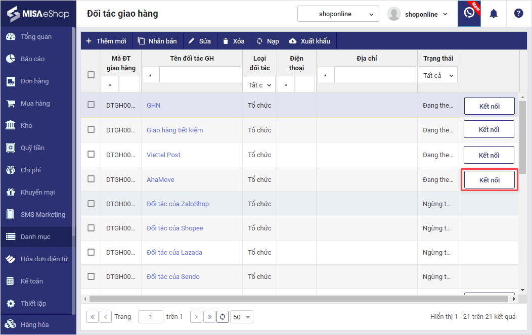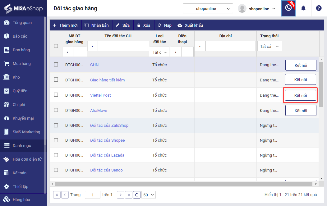 – Tích chọn Kết nối vào dòng Giao hàng nhanh/Giao hàng tiết kiệm trên màn hình Danh sách đối tác giao hàng