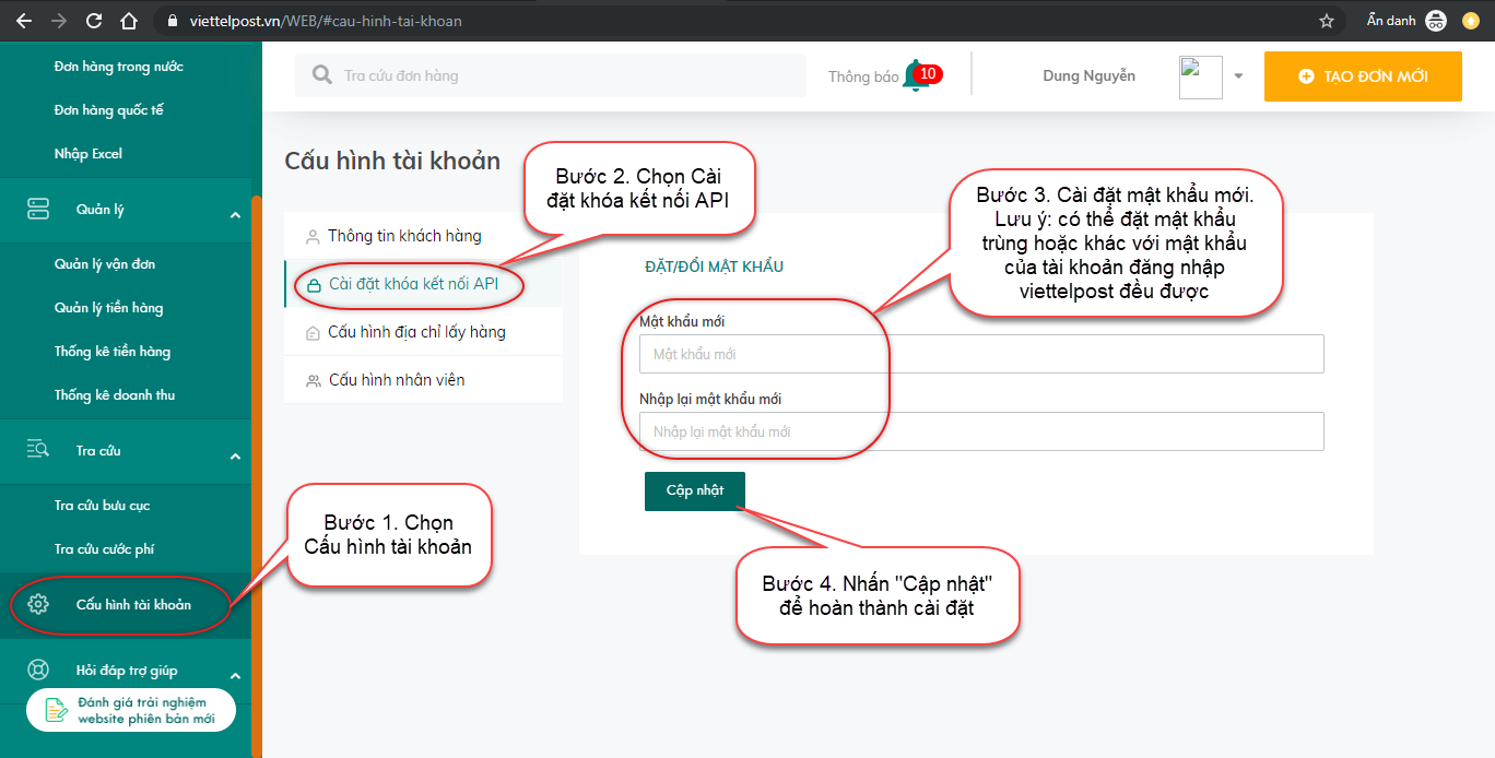 – Đăng nhập vào tài khoản Viettel Post để cài đặt khóa kết nối API