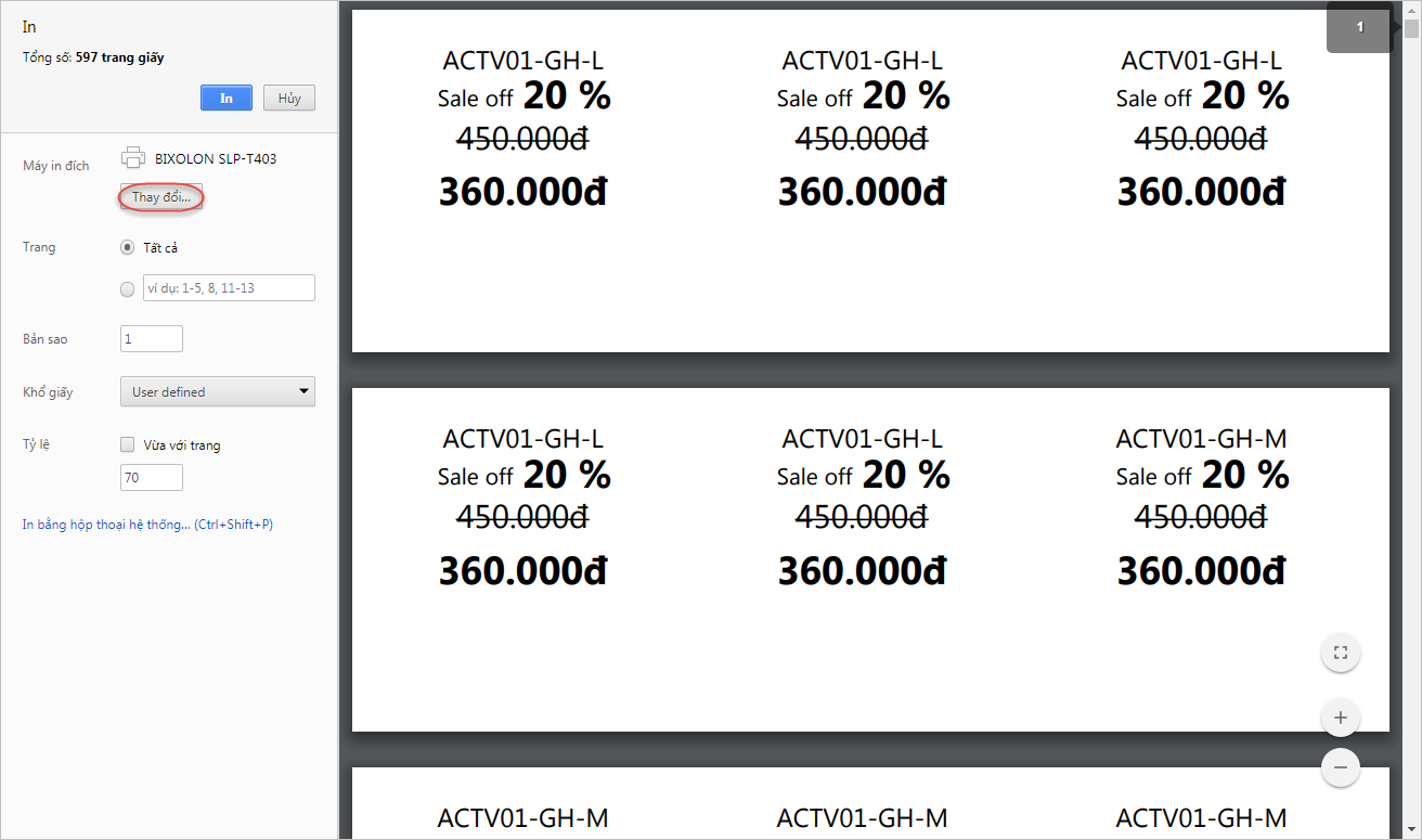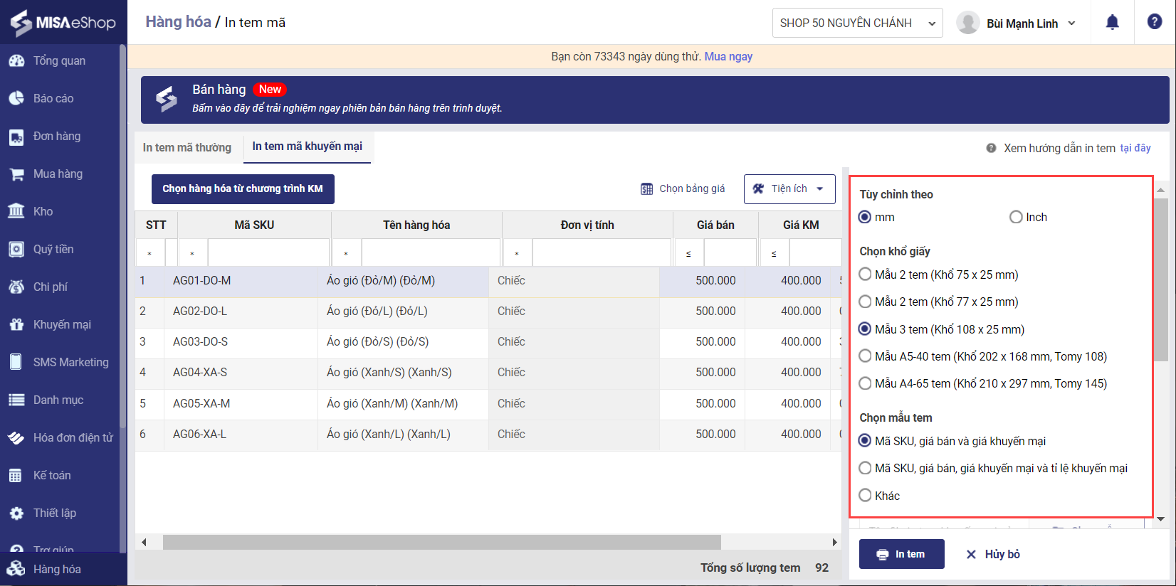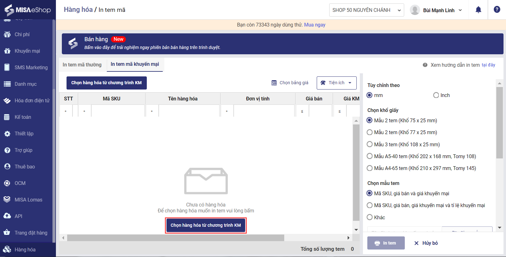 Để in tem cho những hàng hóa khuyến mại, thực hiện như sau: