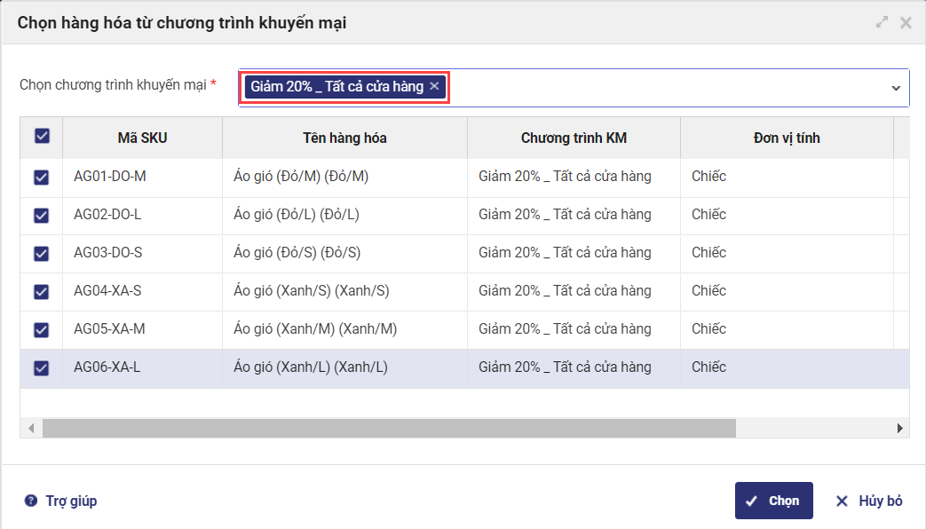 4. Chọn hàng hóa muốn in tem, nhấn Chọn.