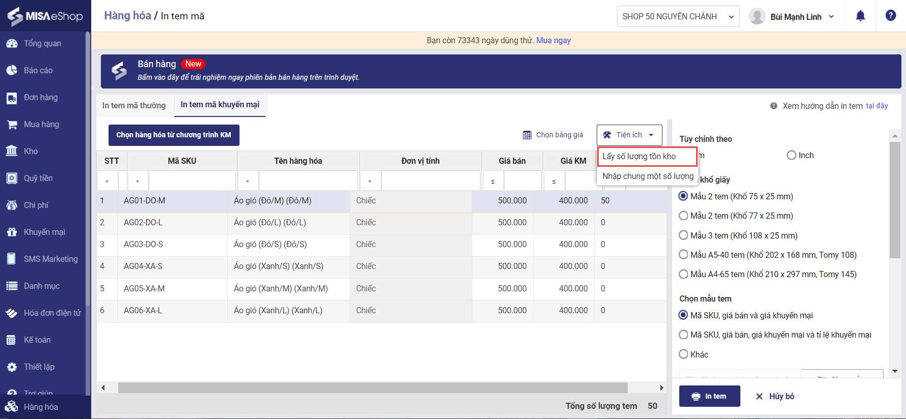 Giúp quản lý cửa hàng in tem mã cho những hàng hóa được khuyến mại của cửa hàng. (Chỉ áp dụng cho những hàng hóa nằm trong chương trình khuyến mại Giảm giá hàng hóa)