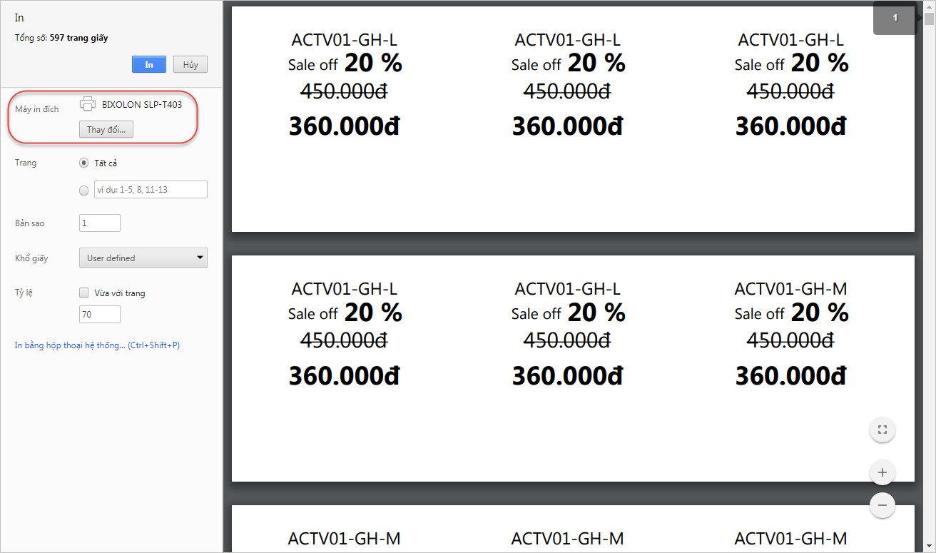 9. Chọn máy in tem tại thông tin Máy in đích.