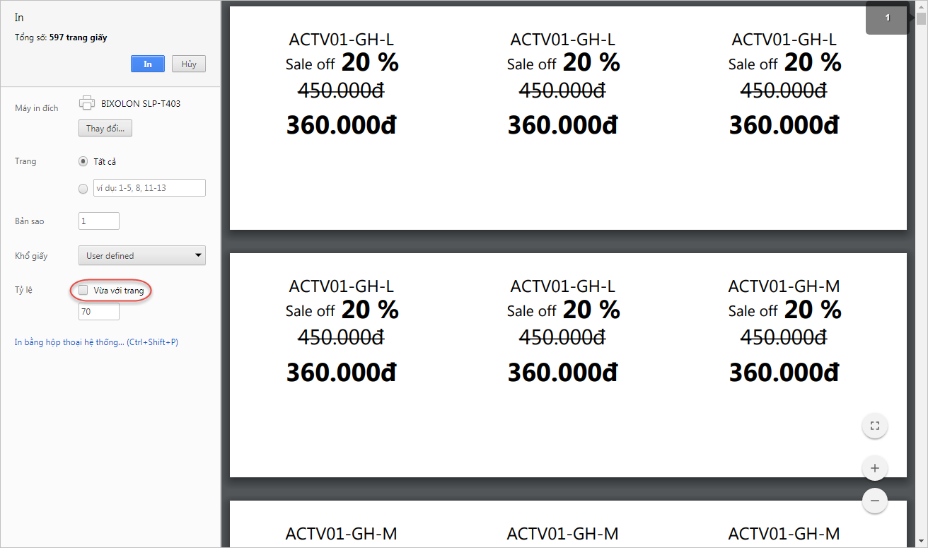 Lưu ý: Bỏ tích chọn thông tin Tỷ lệ Vừa với trang.