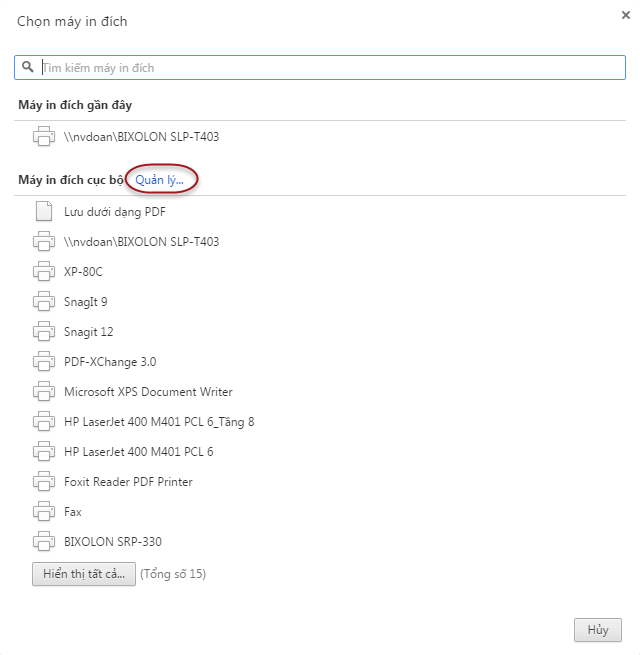 - Tại thông tin Máy in đích cục bộ, nhấn chọn Quản lý.