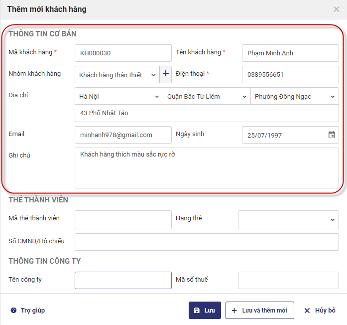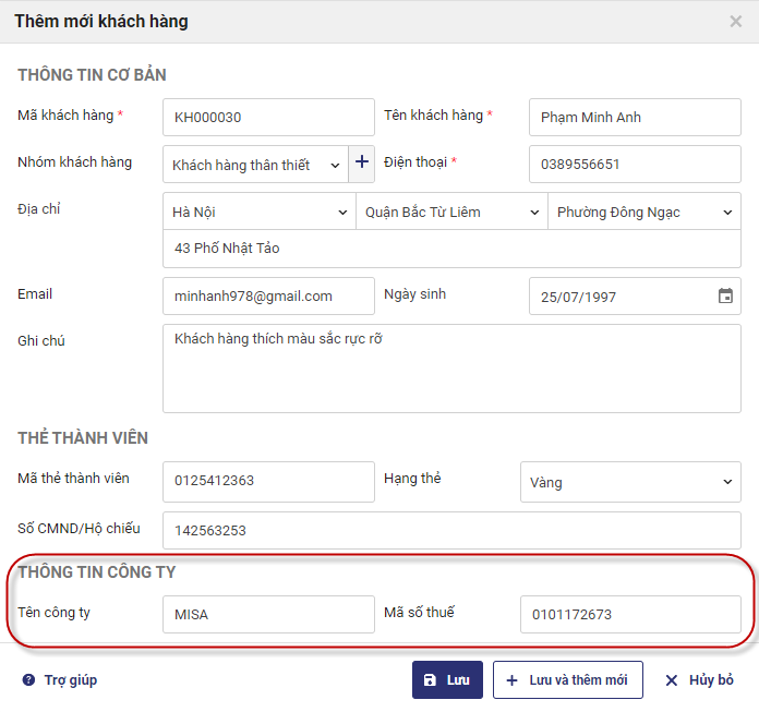 6. Khai báo xong khách hàng, nhấn Lưu.