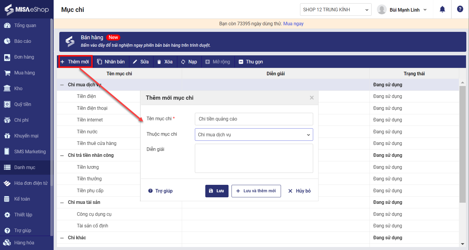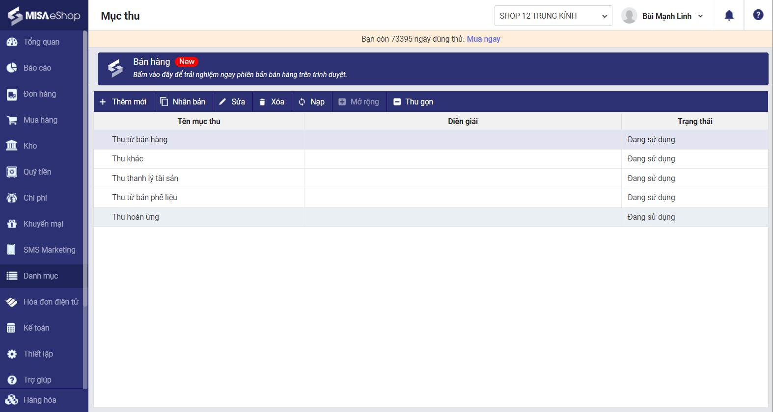 3. Nếu quản lý cửa hàng muốn theo dõi thu theo mục riêng chưa có trong danh sách, nhấn Thêm mới để khai báo.