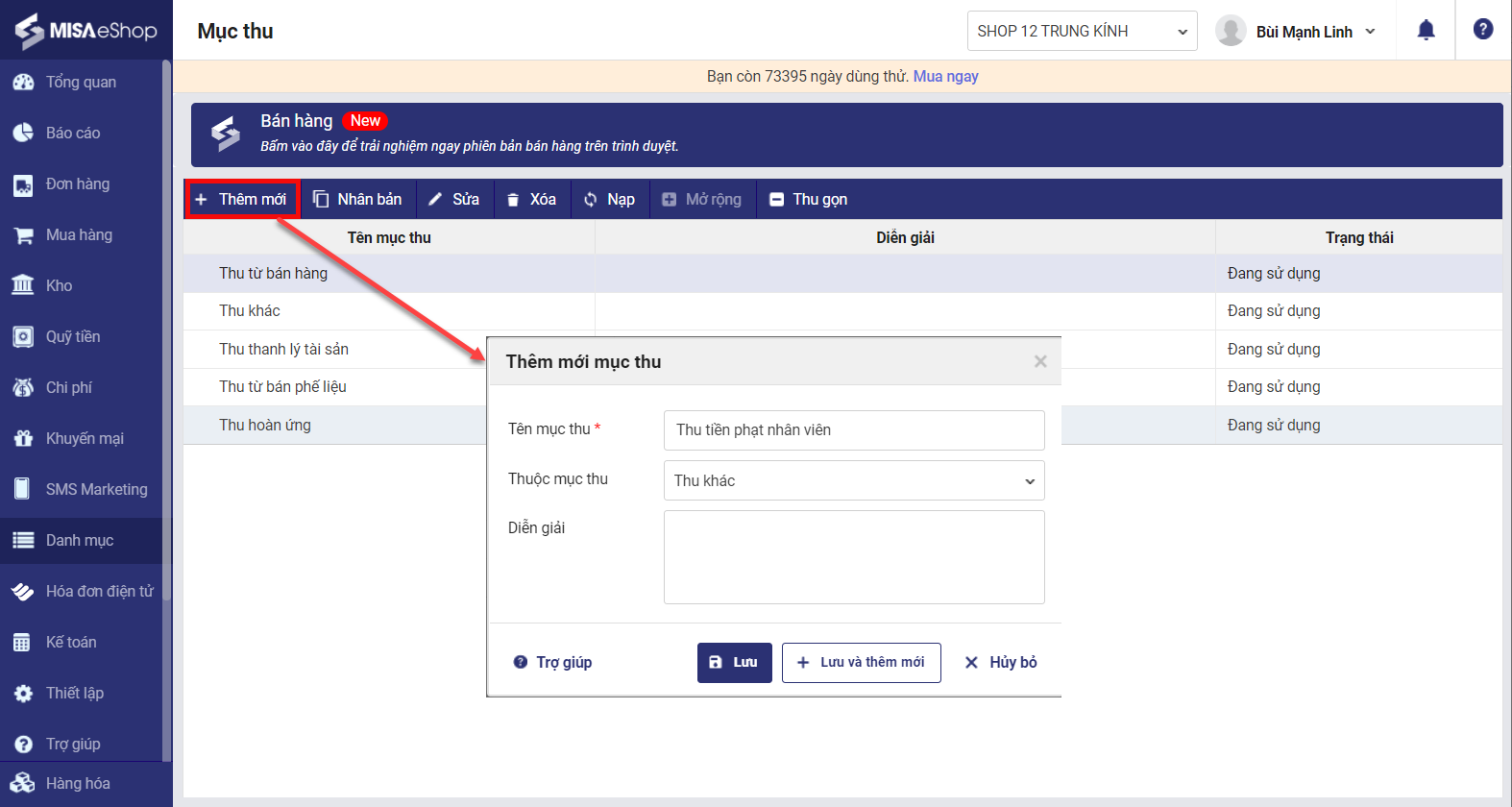 2. Nếu quản lý cửa hàng muốn theo dõi thu theo mục riêng chưa có trong danh sách, nhấn Thêm mới để khai báo.