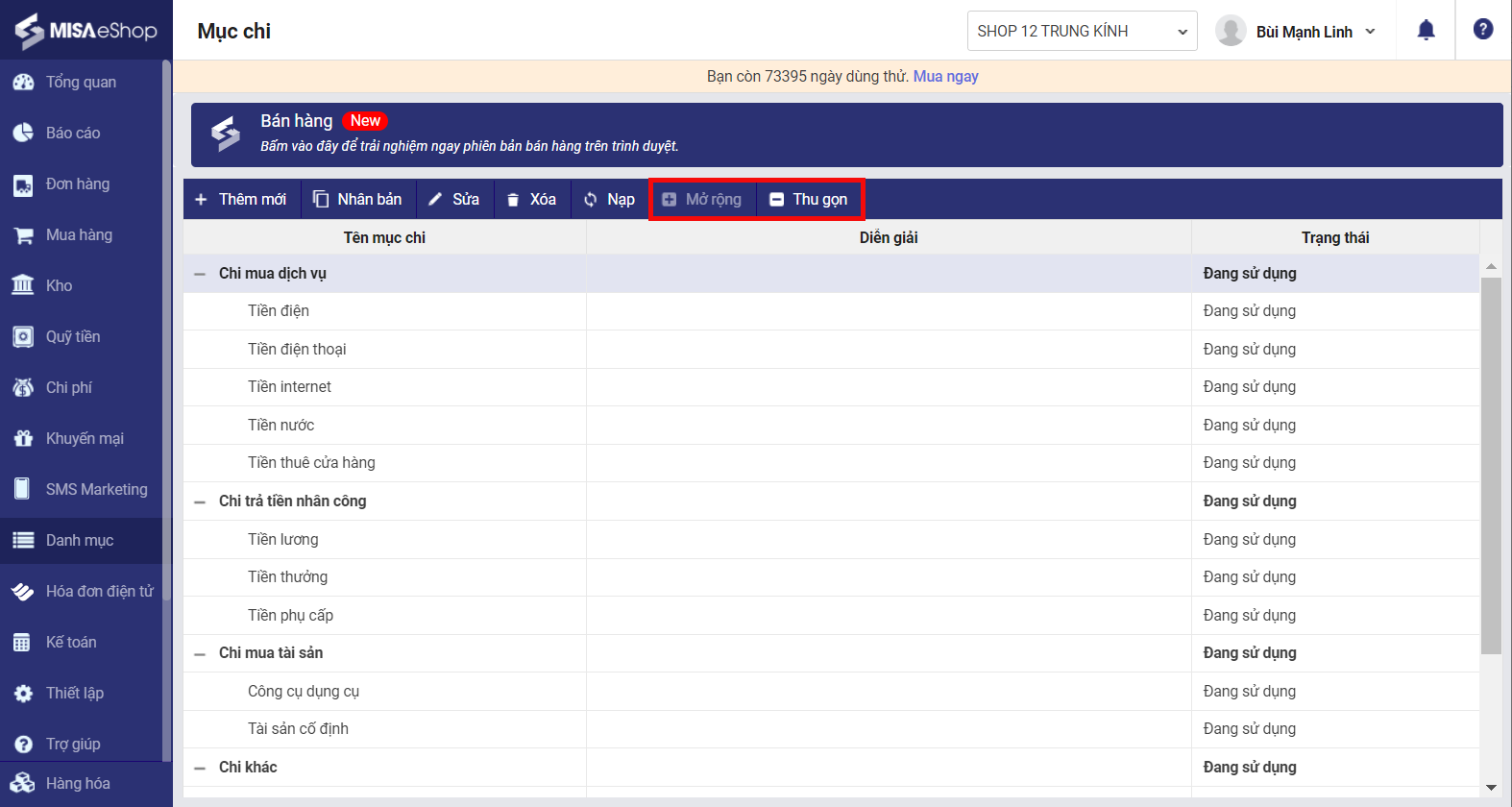 Có thể nhấn Mở rộng/Thu gọn để mở/đóng nhanh tất cả các mục thu có trong danh sách.