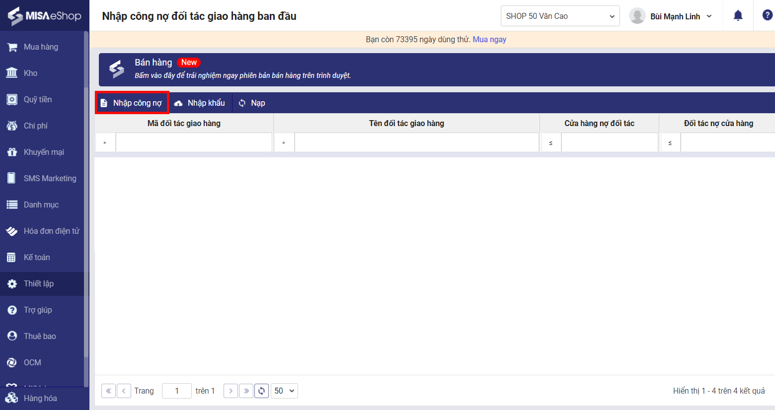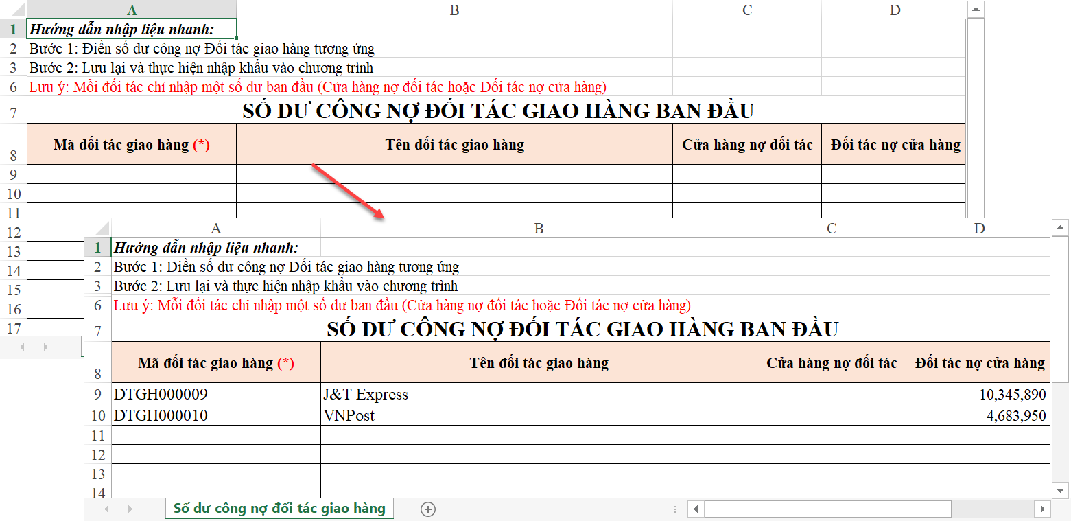 3.2 Chuyển số dư công nợ đối tác giao hàng mà cửa hàng đang quản lý trên file excel vào phần mềm