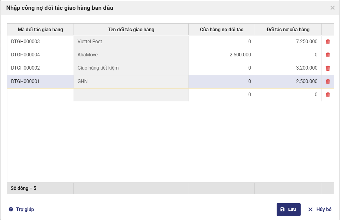 3.1 Khai báo số dư công nợ của từng đối tác giao hàng