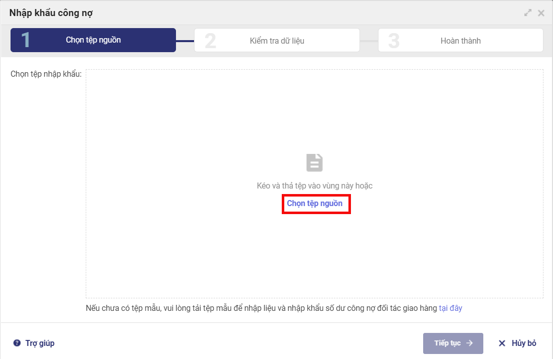 3. Nhấn Chọn tệp nguồn để tải lên file excel vừa thiết lập.