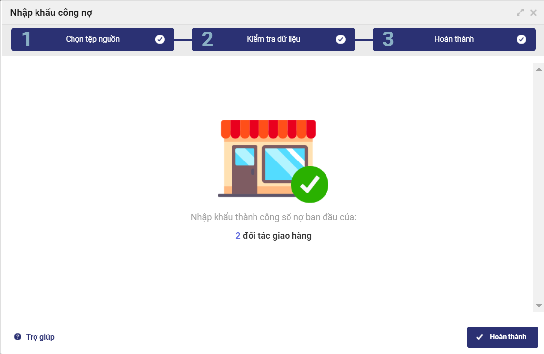 6. Tại bước Hoàn thành, hệ thống sẽ thực hiện nhập khẩu những dòng hợp lệ vào phần mềm và thông báo kết quả nhập khẩu.