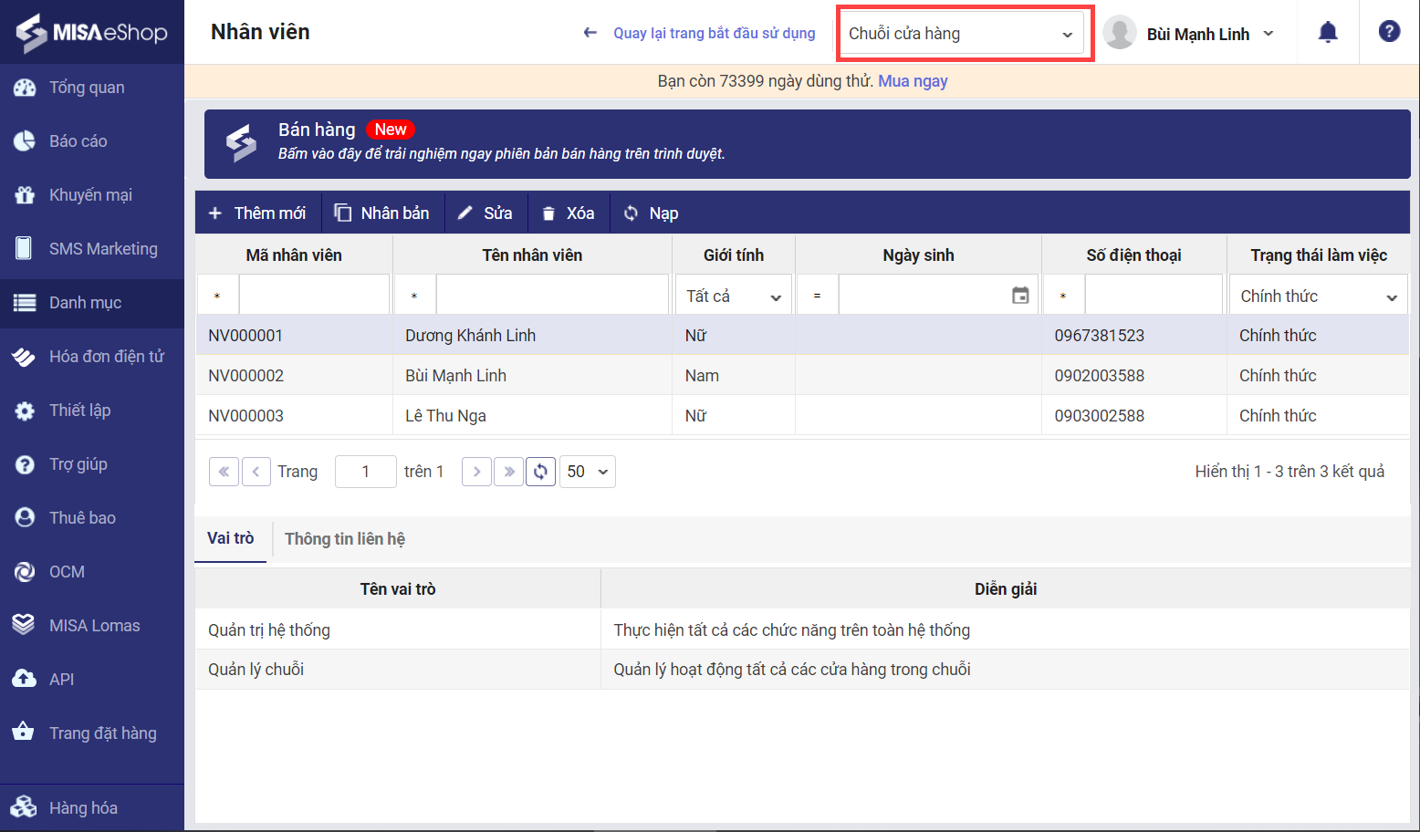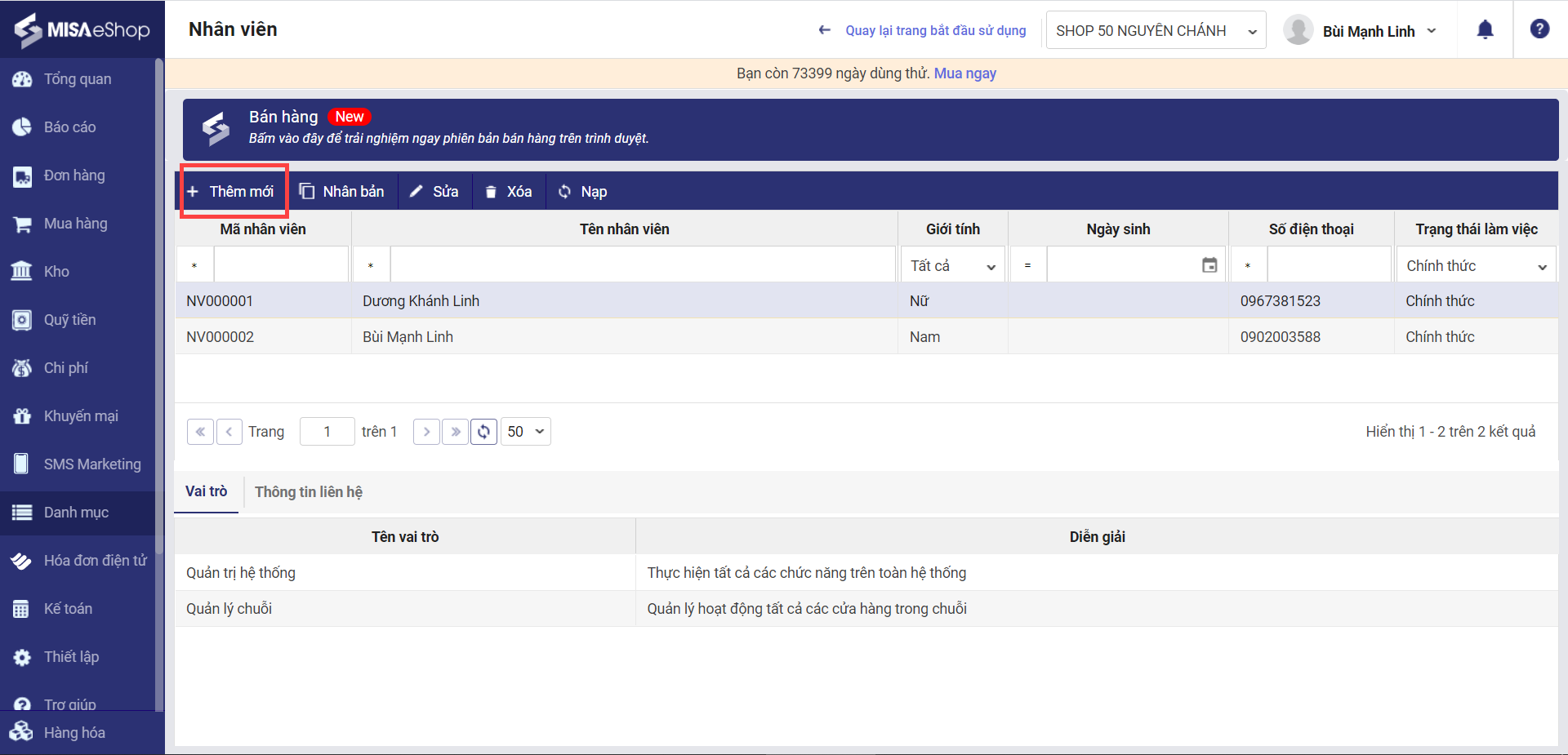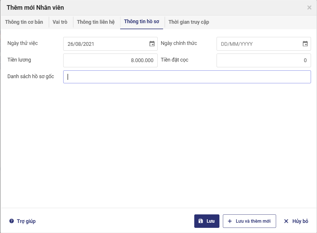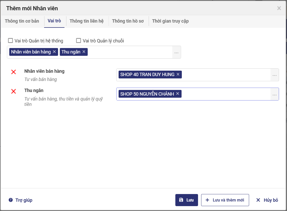- Nhấn tab Vai trò để khai báo vai trò cho nhân viên: