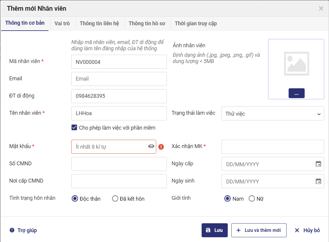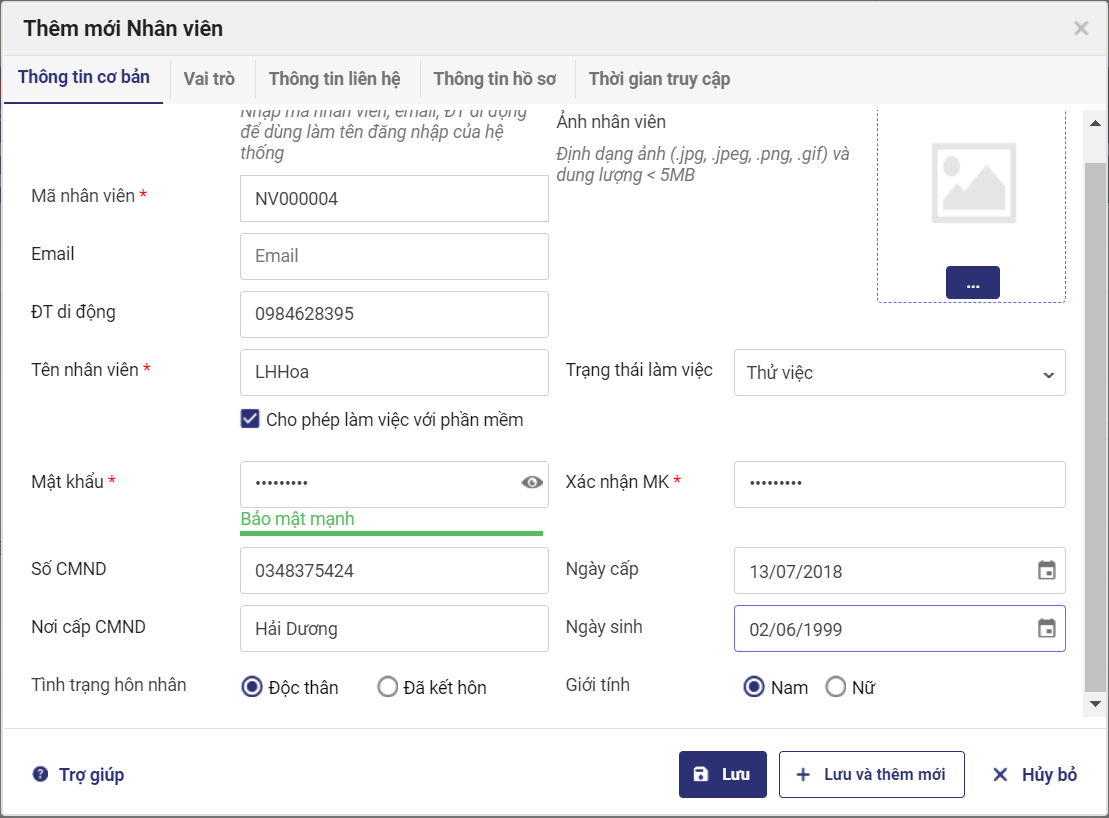 5. Khai báo các thông tin về Số chứng minh nhân dân, trạng thái làm việc, Số điện thoại, Giới tính và Tình trạng hôn nhân của nhân viên. Có thể cập nhật ảnh đại diện cho nhân viên để tiện theo dõi.