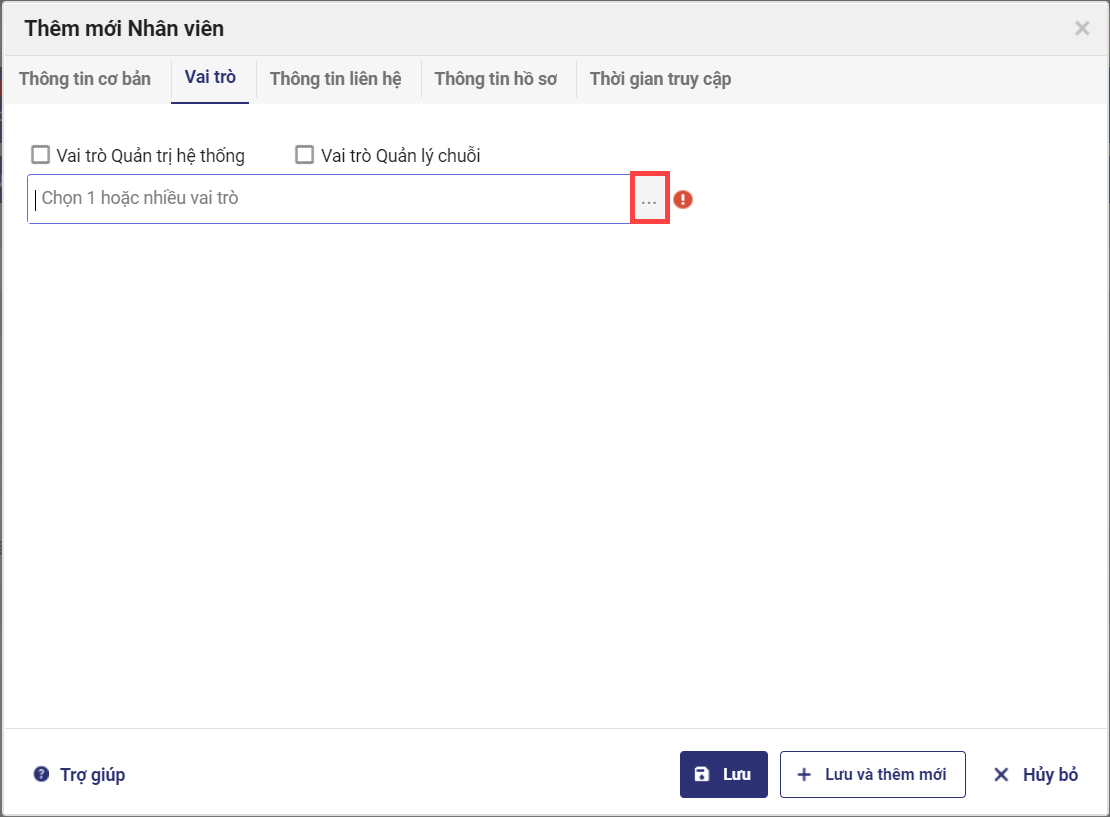 Tại mục Vai trò, nhấn chọn vai trò mà nhân viên đảm nhiệm. Lặp lại thao tác trên để chọn thêm vai trò cho nhân viên.