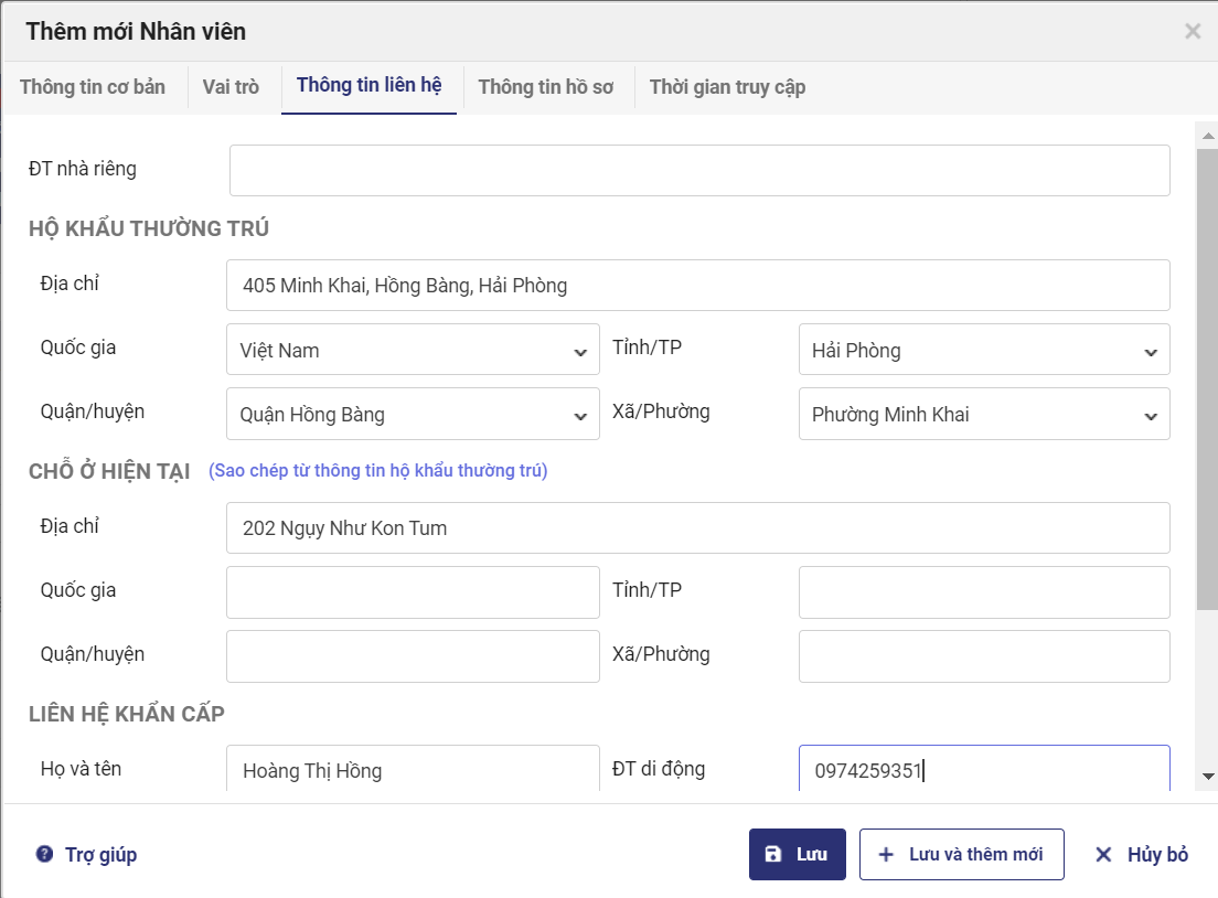 6. Khai báo Thông tin liên hệ và Thông tin hồ sơ của nhân viên (nếu cần) .