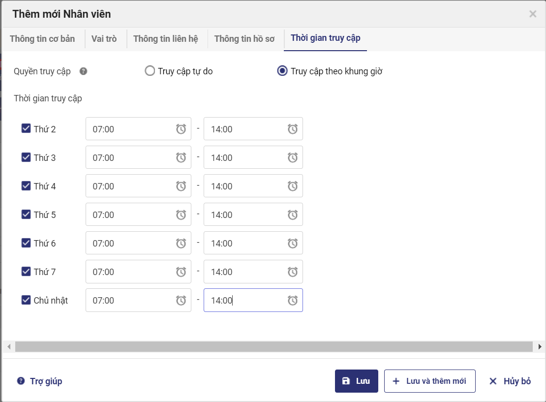 7. Nếu muốn quản lý thời gian làm việc của nhân viên trên phần mềm, nhấn chọn sang tab Thời gian truy cập, tích chọn Truy cập theo giờ và khai báo thời gian cho phép nhân viên làm việc với phần mềm MShopKeeper.