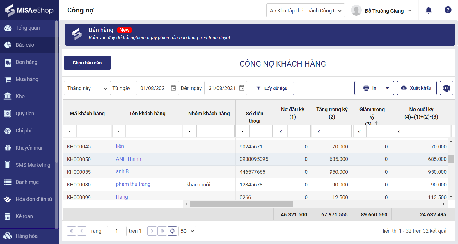 1. Chọn Báo cáo\Công nợ, mặc định hệ thống sẽ hiển thị báo cáo Công nợ khách hàng.