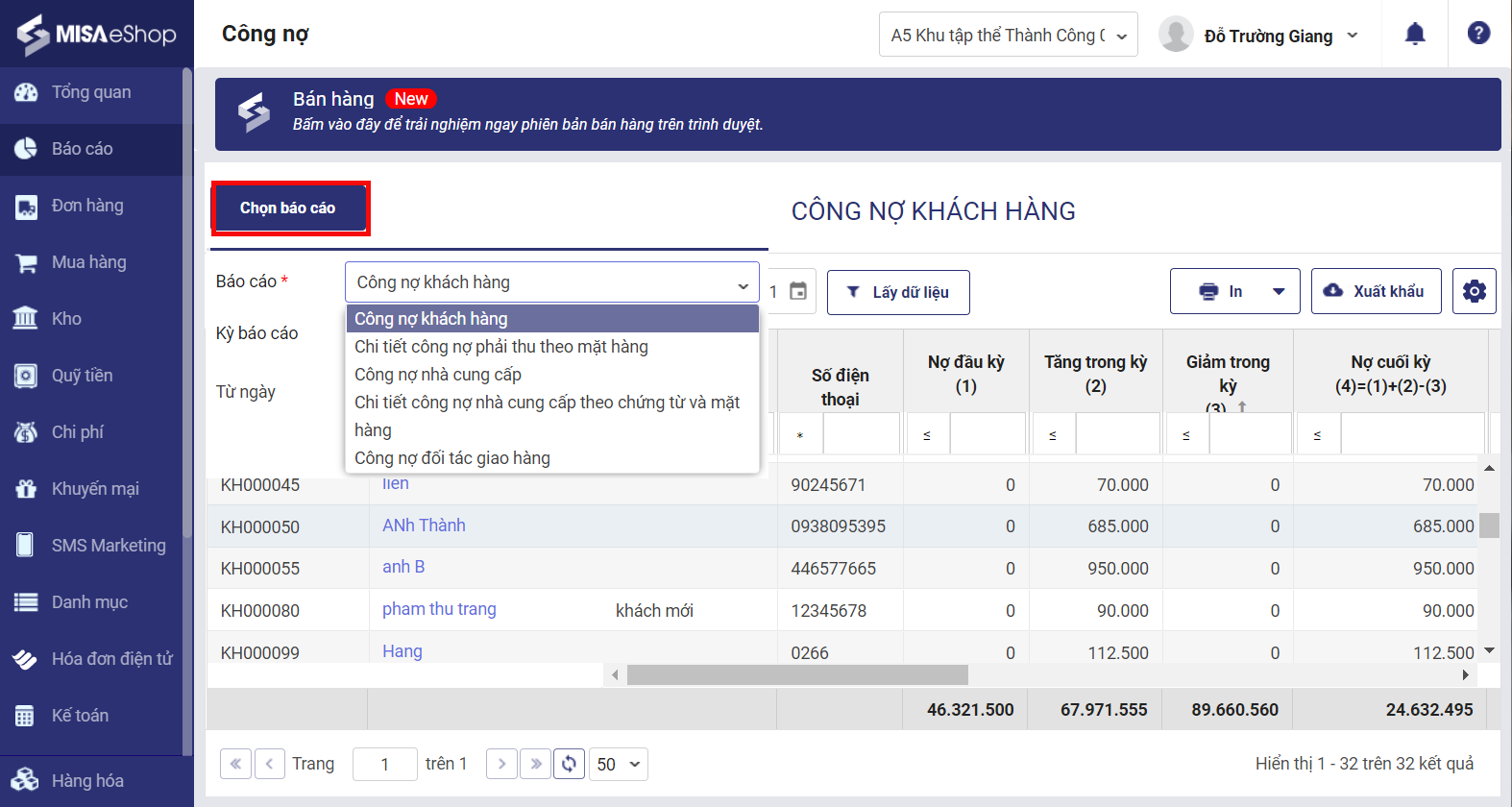 Xem danh sách báo cáo công nợ