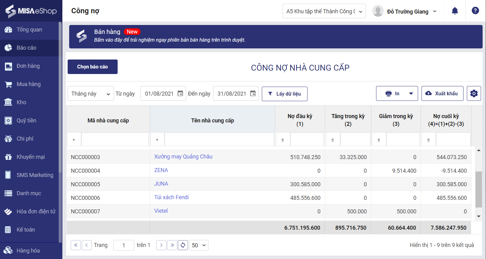 4. Báo cáo Công nợ nhà cung cấp.