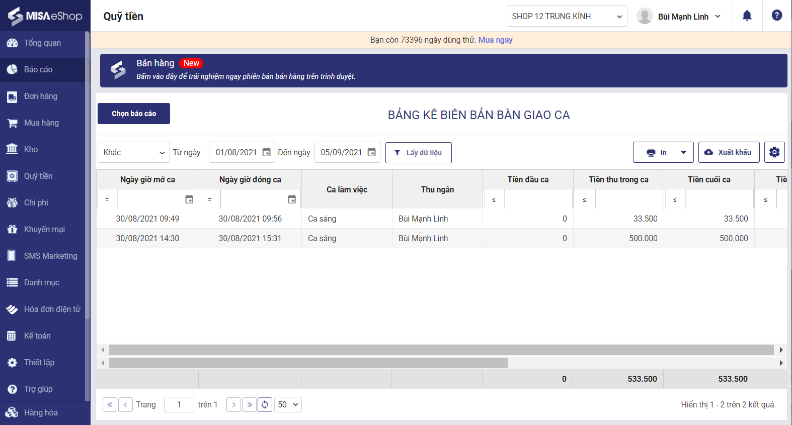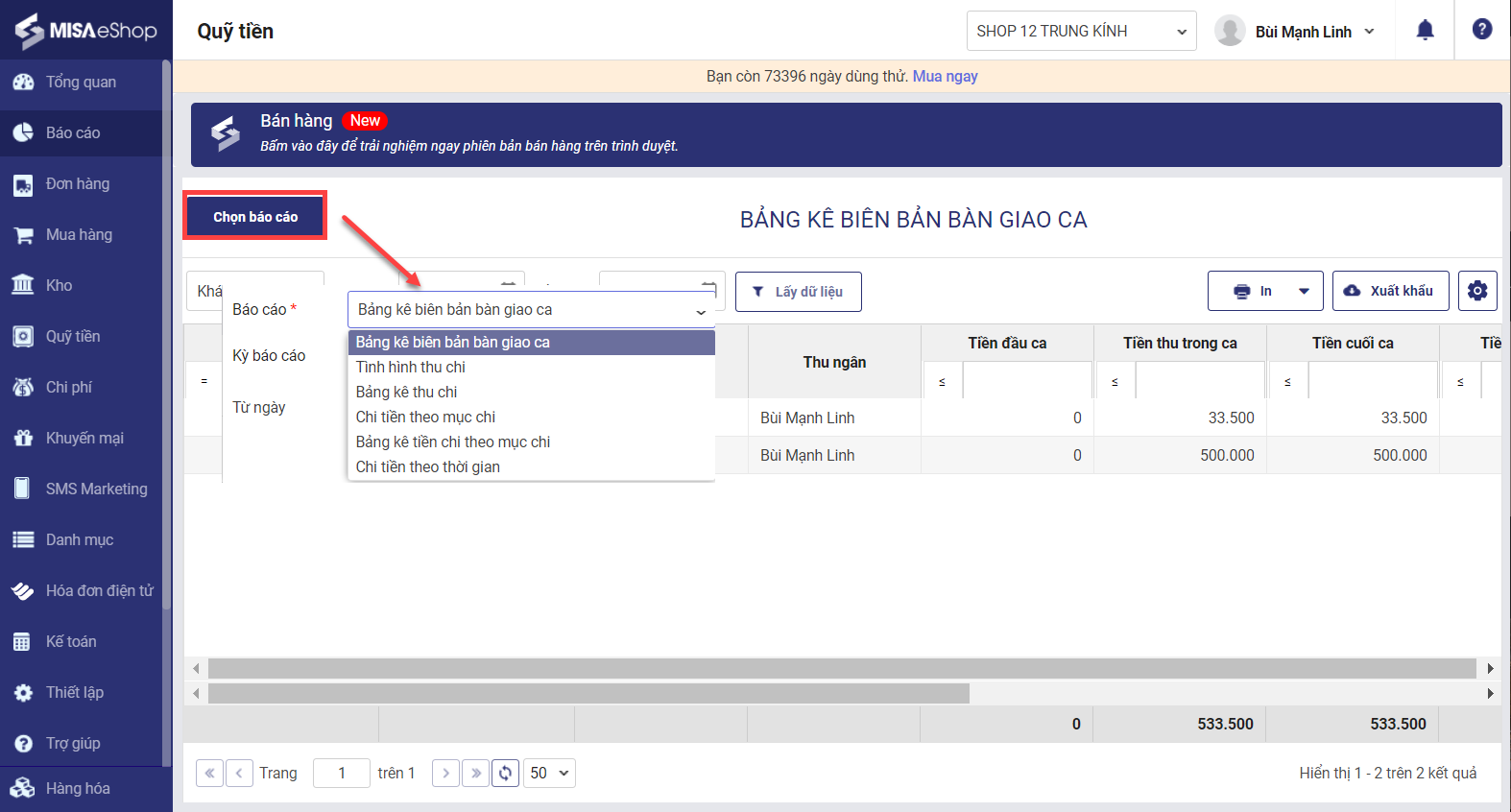 1. Chọn Báo cáo\Quỹ tiền, mặc định hệ thống sẽ hiển thị báo cáo Bảng kê biên bản bàn giao ca.