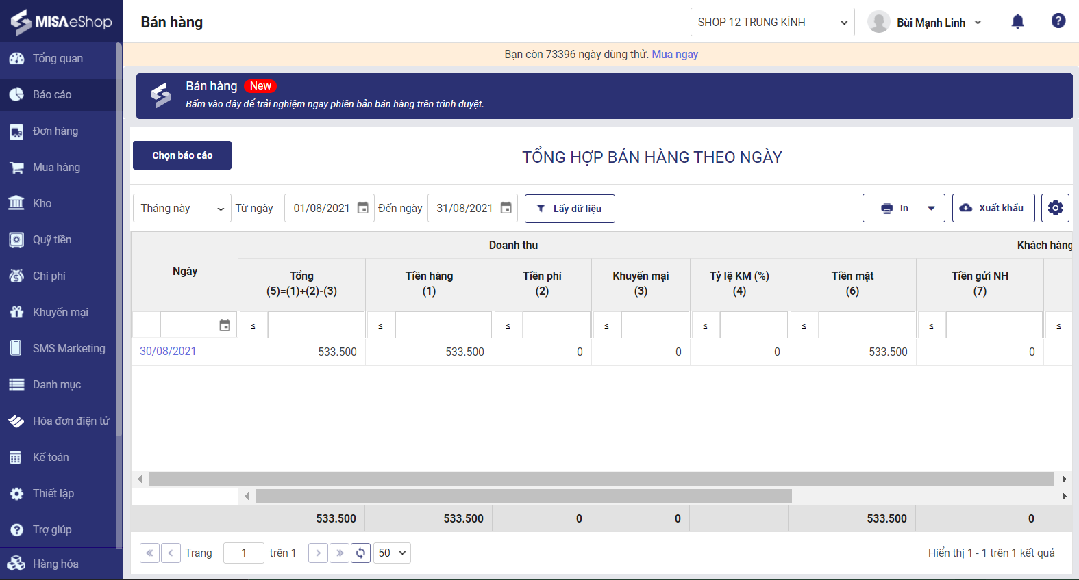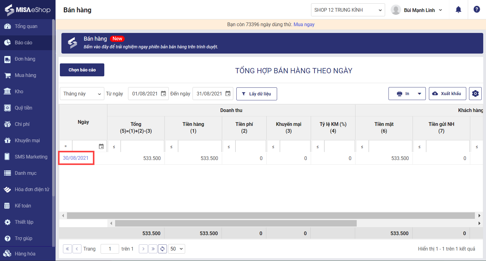 1. Chọn Báo cáo\Bán hàng, mặc định hệ thống sẽ hiển thị báo cáo Tổng hợp bán hàng theo ngày.