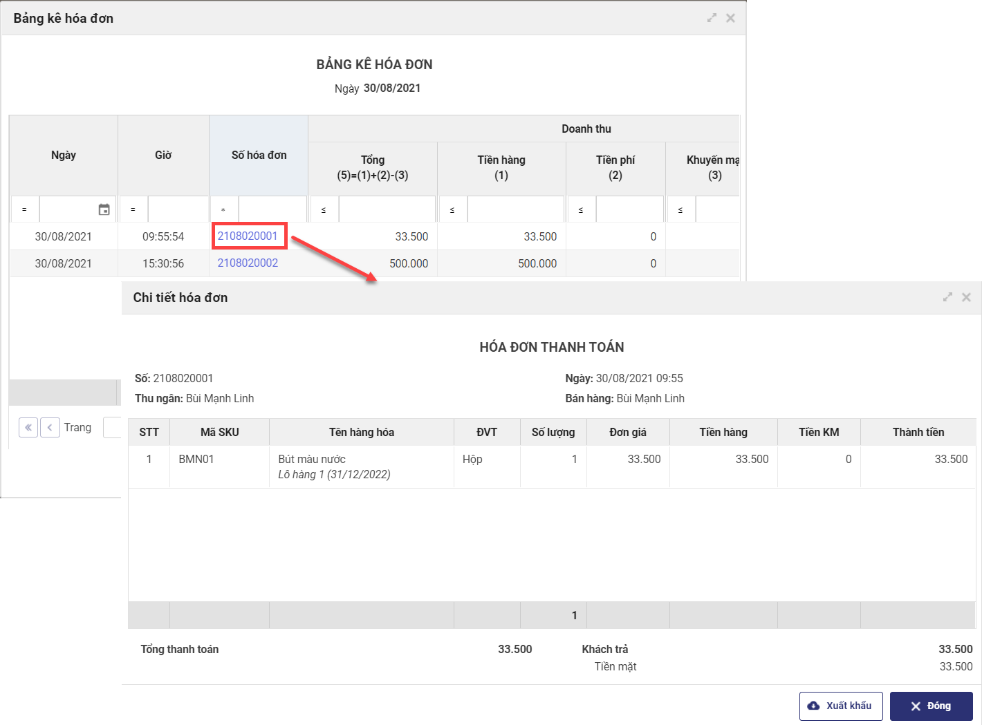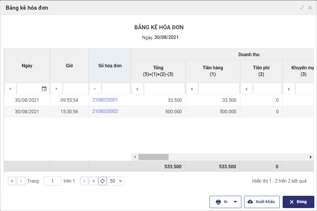 2. Nhấn vào thông tin Ngày để xem chi tiết toàn bộ hóa đơn phát sinh trong ngày.