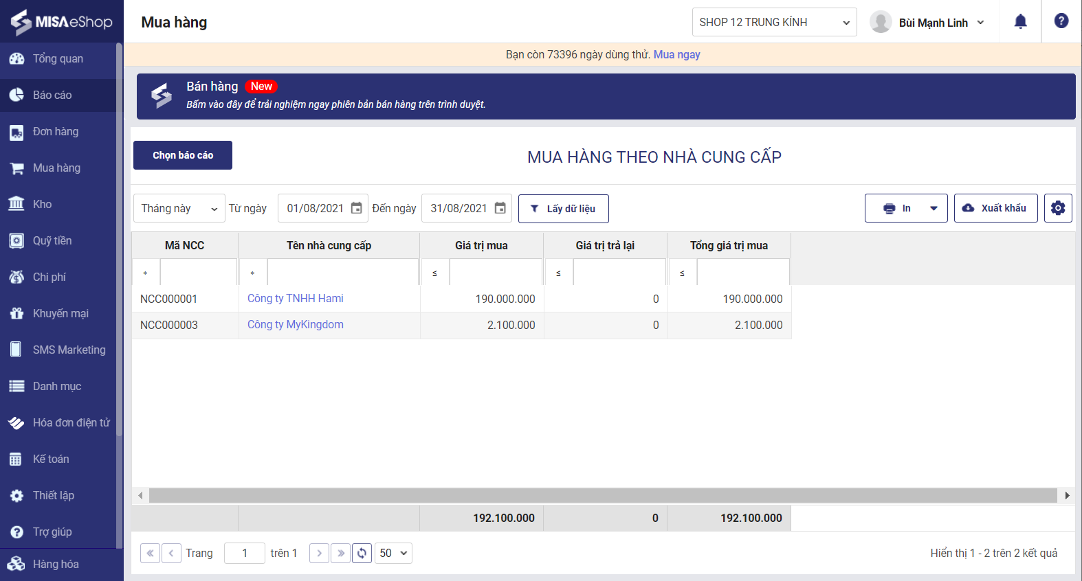 3. Báo cáo Mua hàng theo nhà cung cấp.