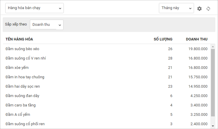Mục đích: Giúp quản lý cửa hàng biết được những hàng hóa nào bán ra số lượng lớn nhất.