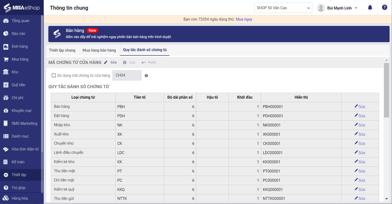 Nhấn Lưu để lưu lại thay đổi. Các chứng từ được lập mới sau này sẽ áp dụng theo quy tắc mới.