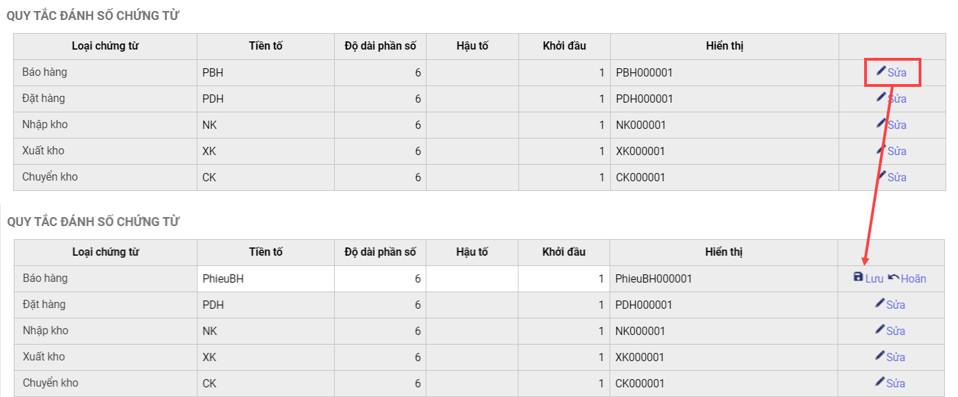 Nhấn Sửa tại loại chứng từ cần thiết lập lại.