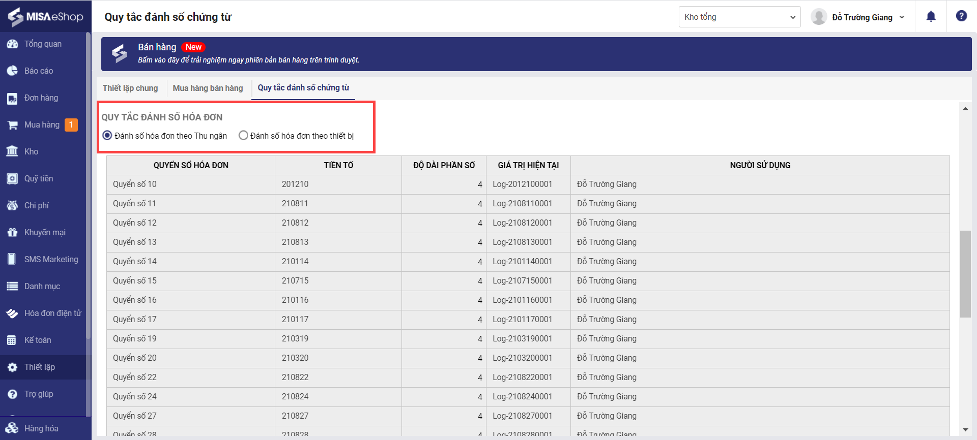 Cho phép quản lý cửa hàng thiết lập quy tắc đánh số chứng từ cho khách hàng, nhân viên,… Đồng thời xem được những sổ hóa đơn nào đang được sử dụng và sử dụng bởi nhân viên nào.