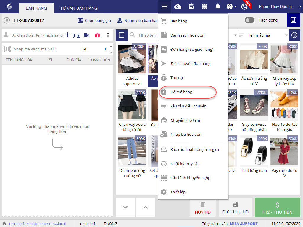 3. Quét mã vạch hàng hóa khách đổi trả hoặc chọn hàng hóa khách đổi trả.