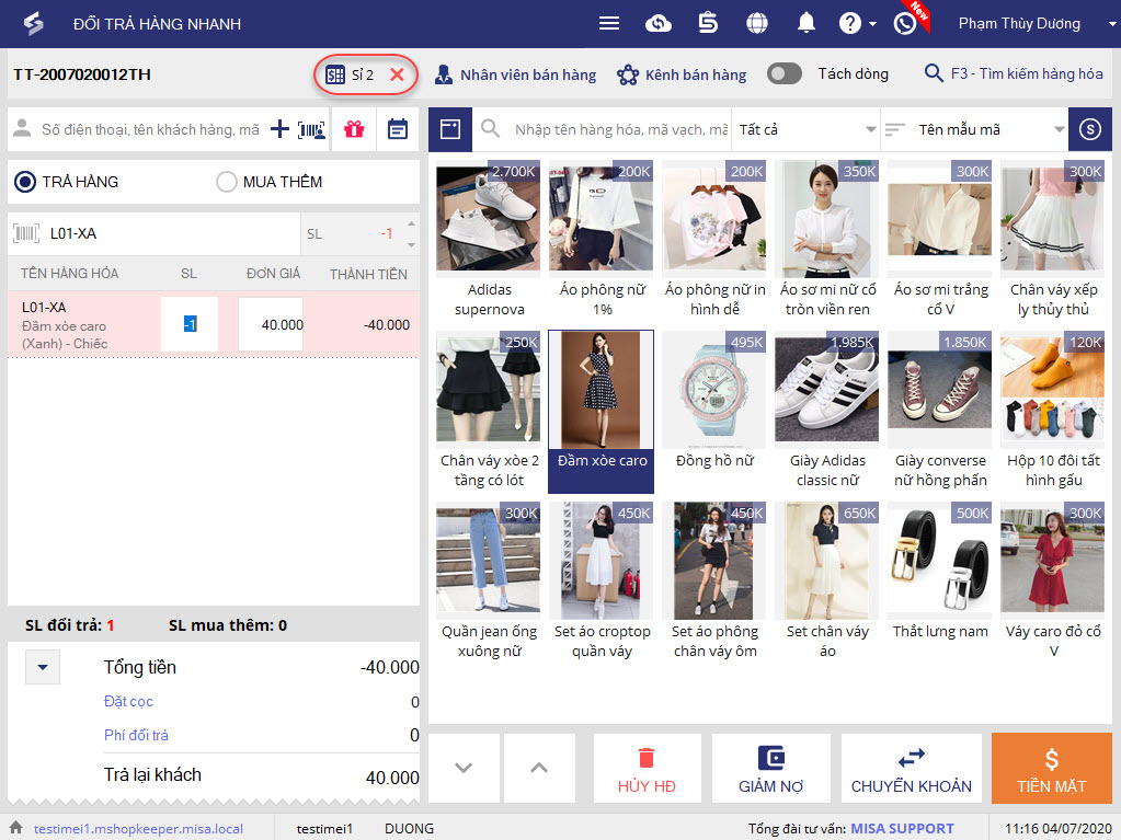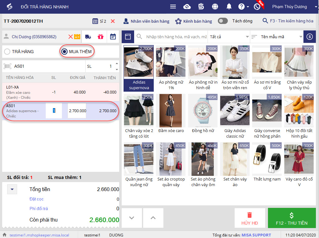 9. Nếu hàng hóa khách mua có giá trị lớn hơn hàng đổi trả, khách sẽ phải trả thêm 1 khoản tiền cho cửa hàng. Chương trình sẽ tự động chuyển sang màn hình Thu tiền nhanh.
