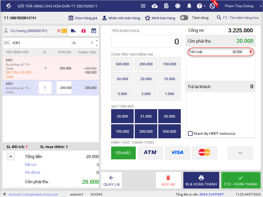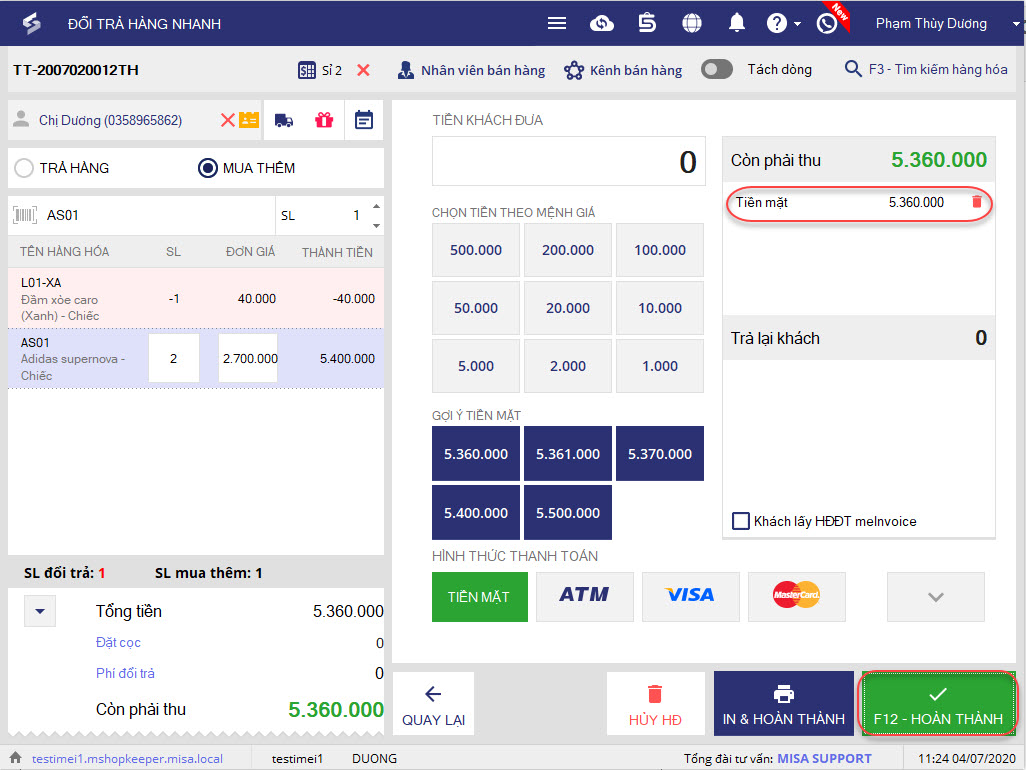 11. Nhập số tiền khách đưa. Sau đó nhấn F12 – Hoàn thành.