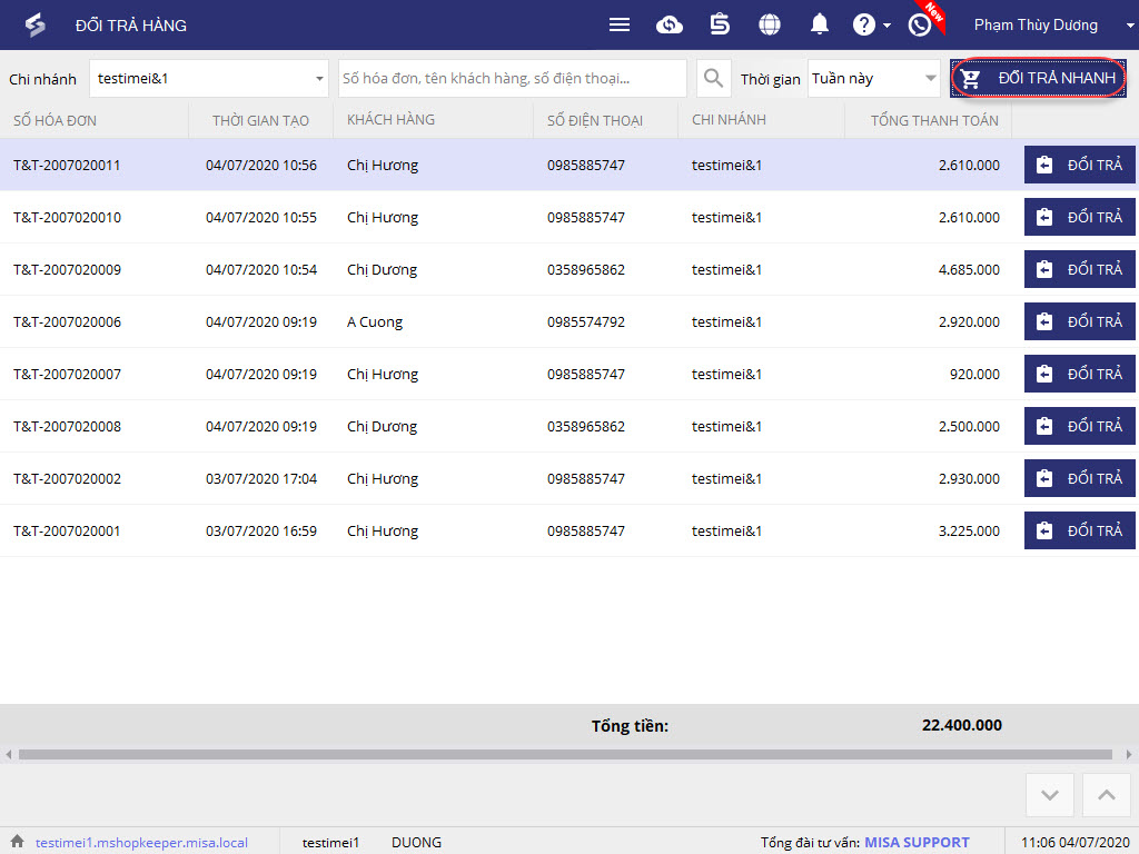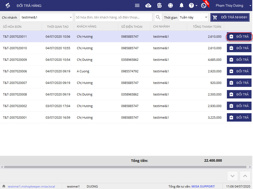 3. Nhấn Đổi trả tương ứng với hóa đơn.